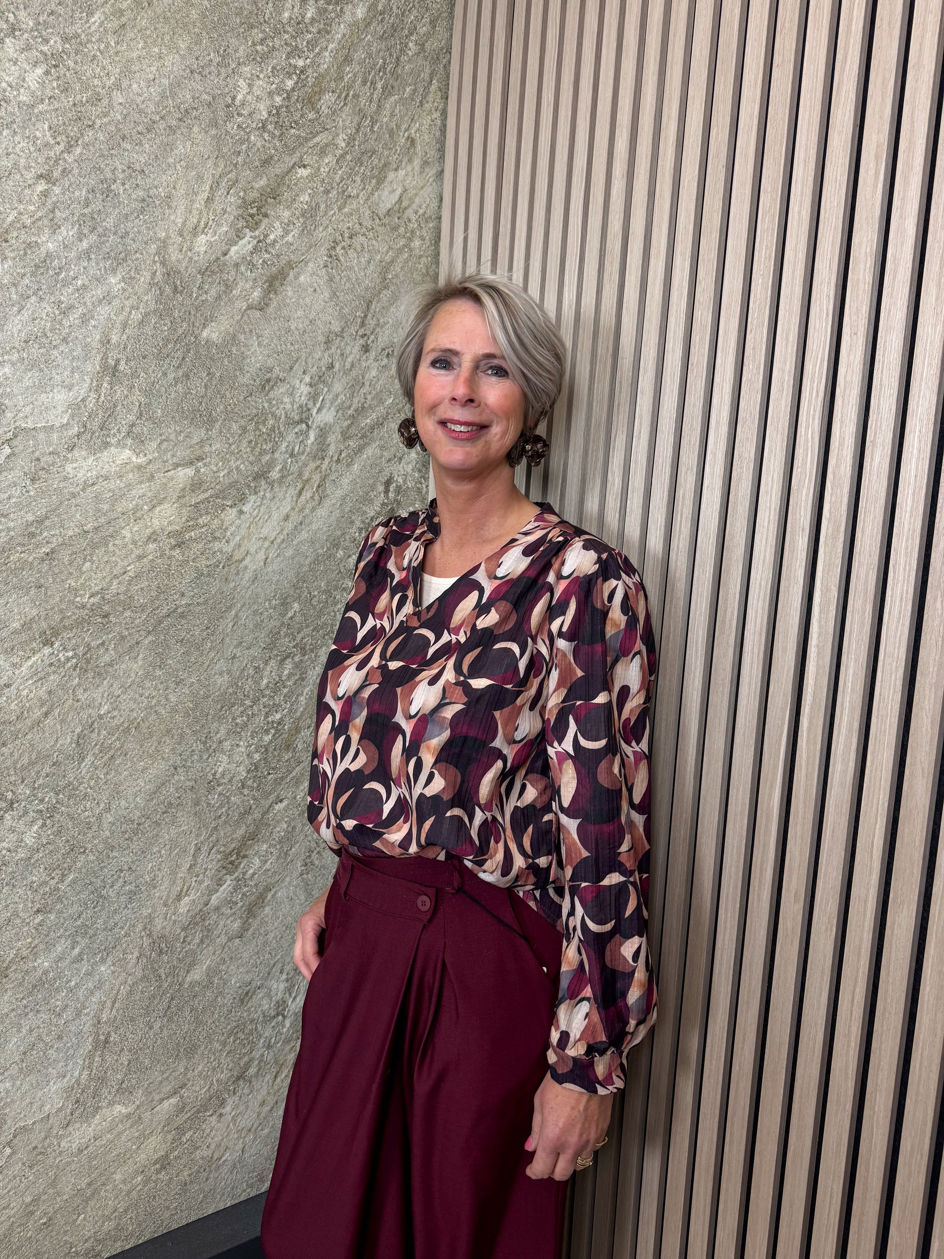 Deze blouse is een echte musthave. De blouse heeft een mooie print. Leuk te combineren met een spencer of gilet.