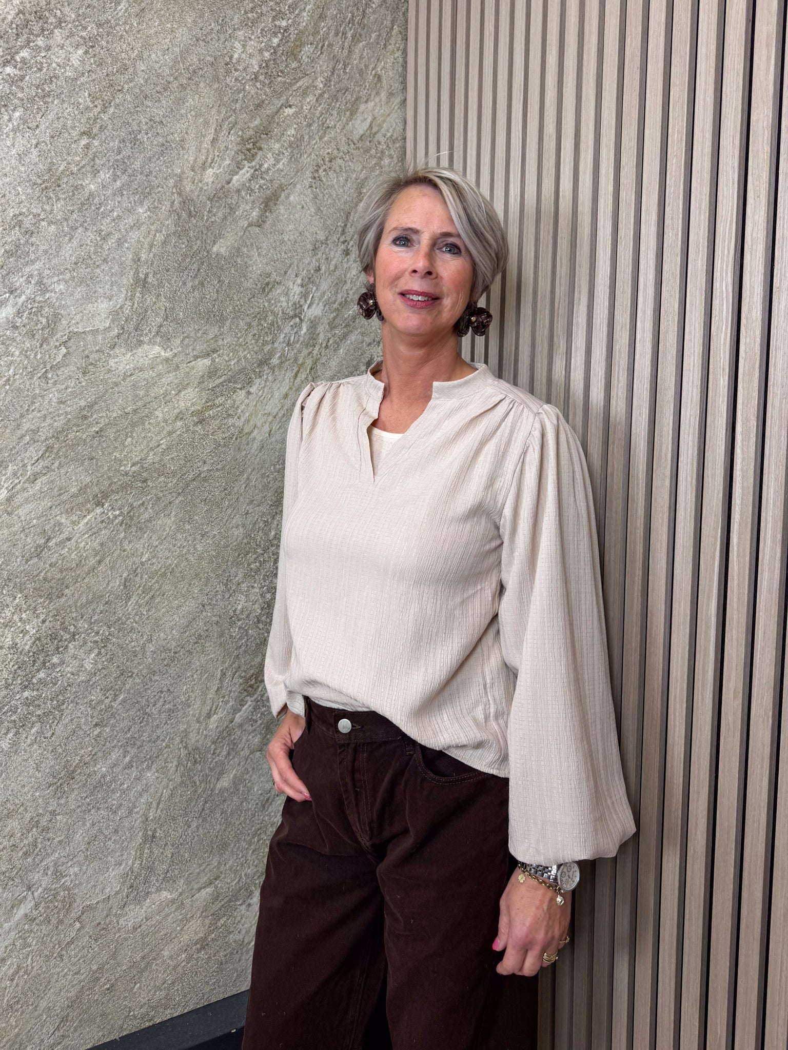 Deze blouse is een echte musthave. De blouse heeft een mooie v-hals en stijlvolle pofmouwen. Leuk te combineren met een spencer of gilet.