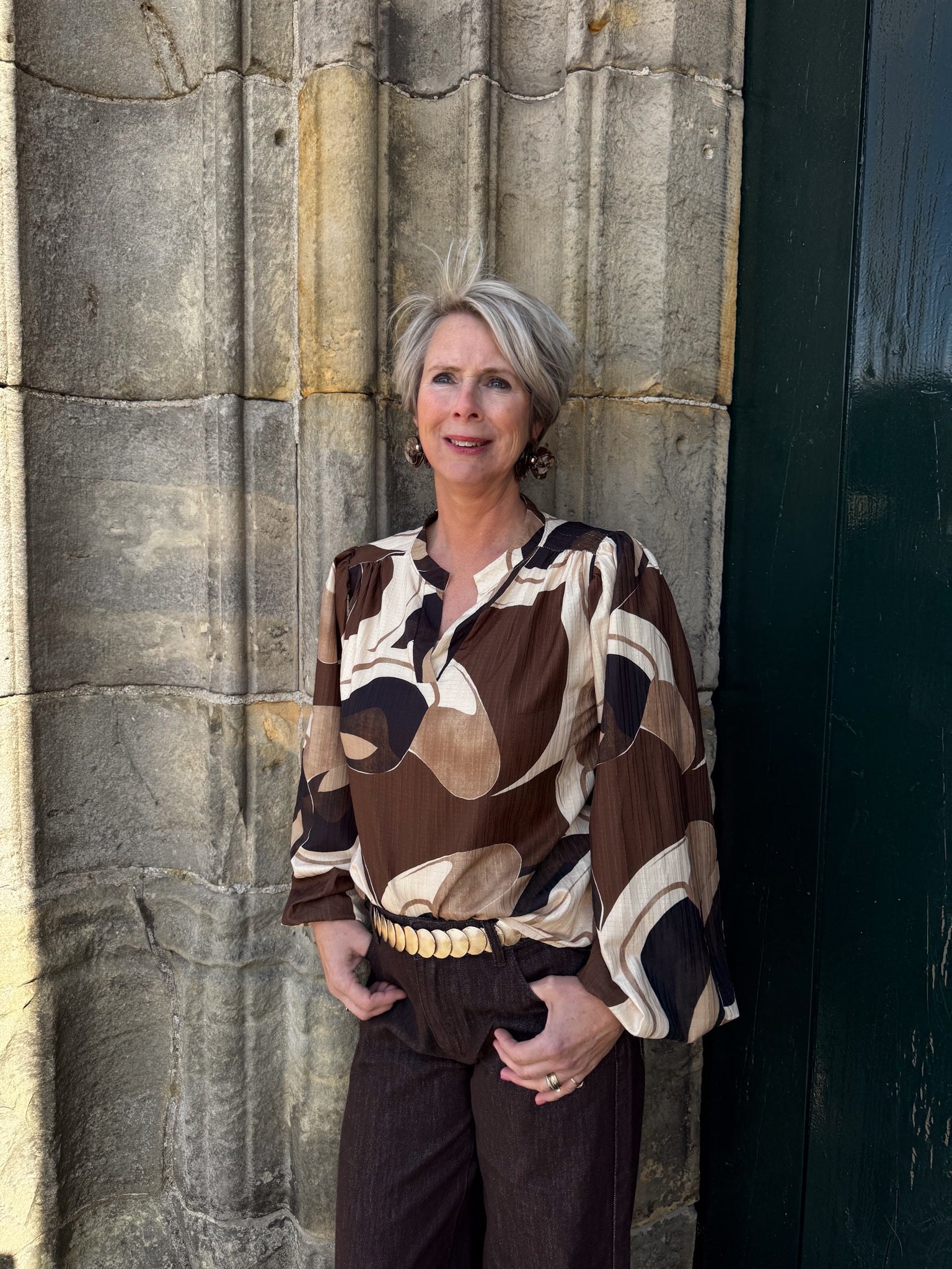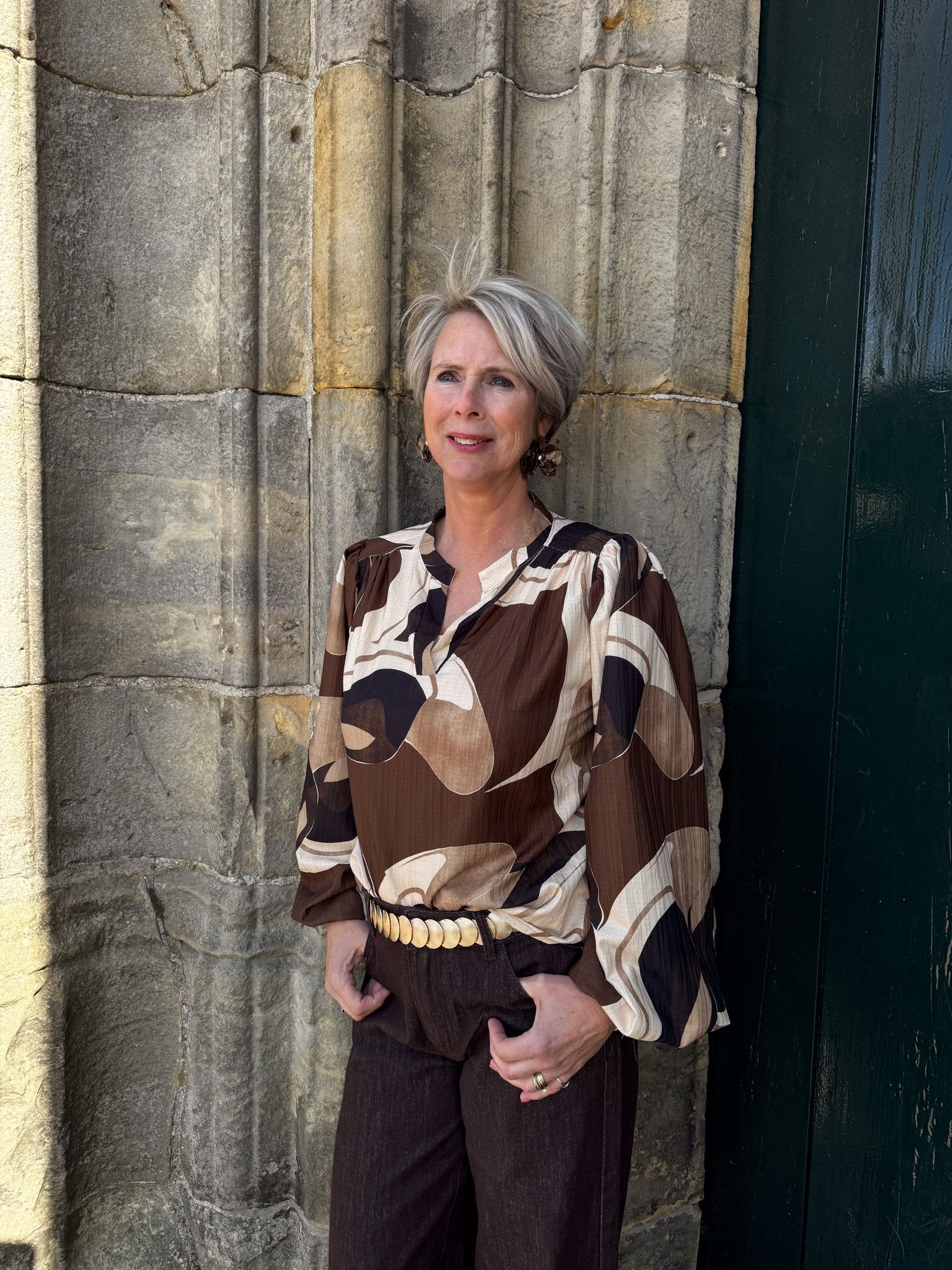Deze blouse is een echte musthave. De blouse heeft een mooie print en stijlvolle pofmouwen. Leuk te combineren met een spencer of gilet.
