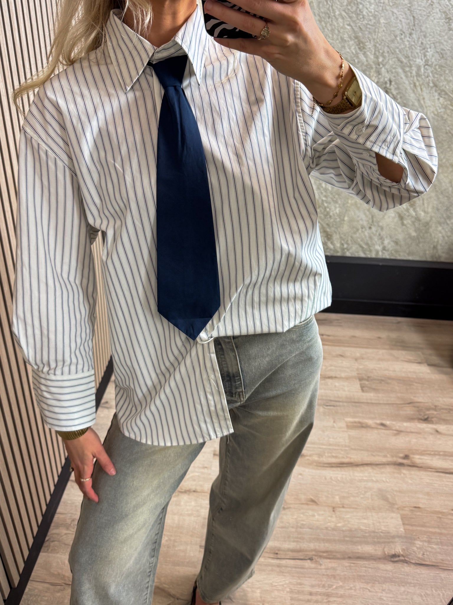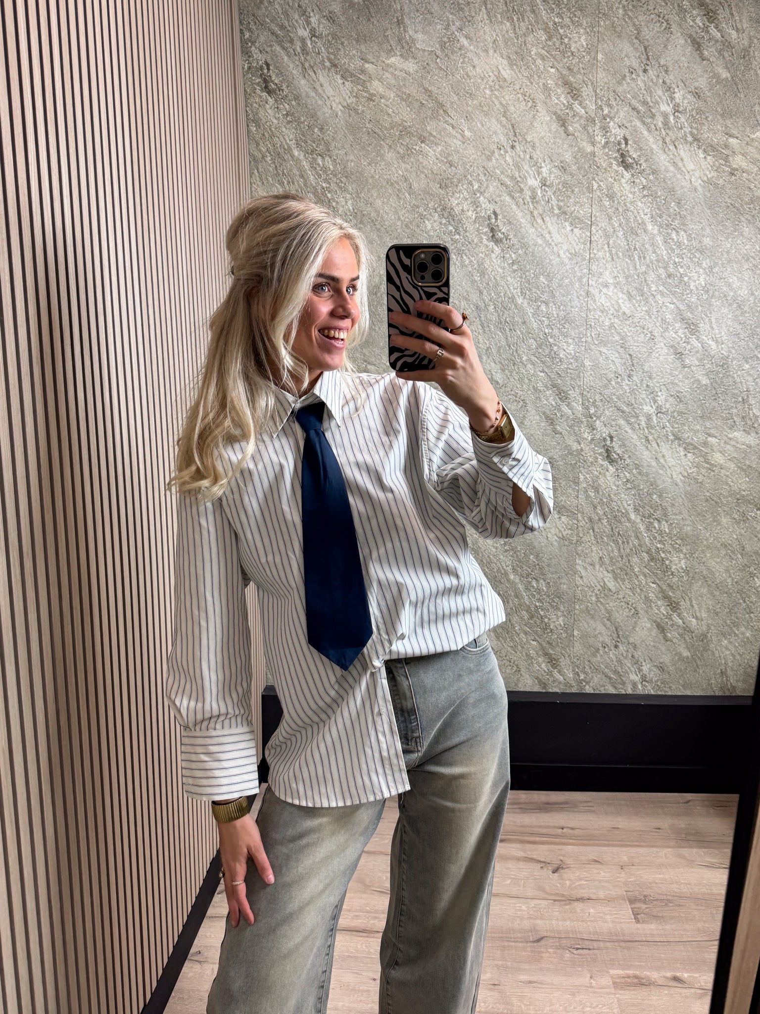 Deze blouse is echt een musthave! De blouse heeft een mooie streepjesprint, een oversized fit en een blauwe stropdas die je er ook af kunt halen.