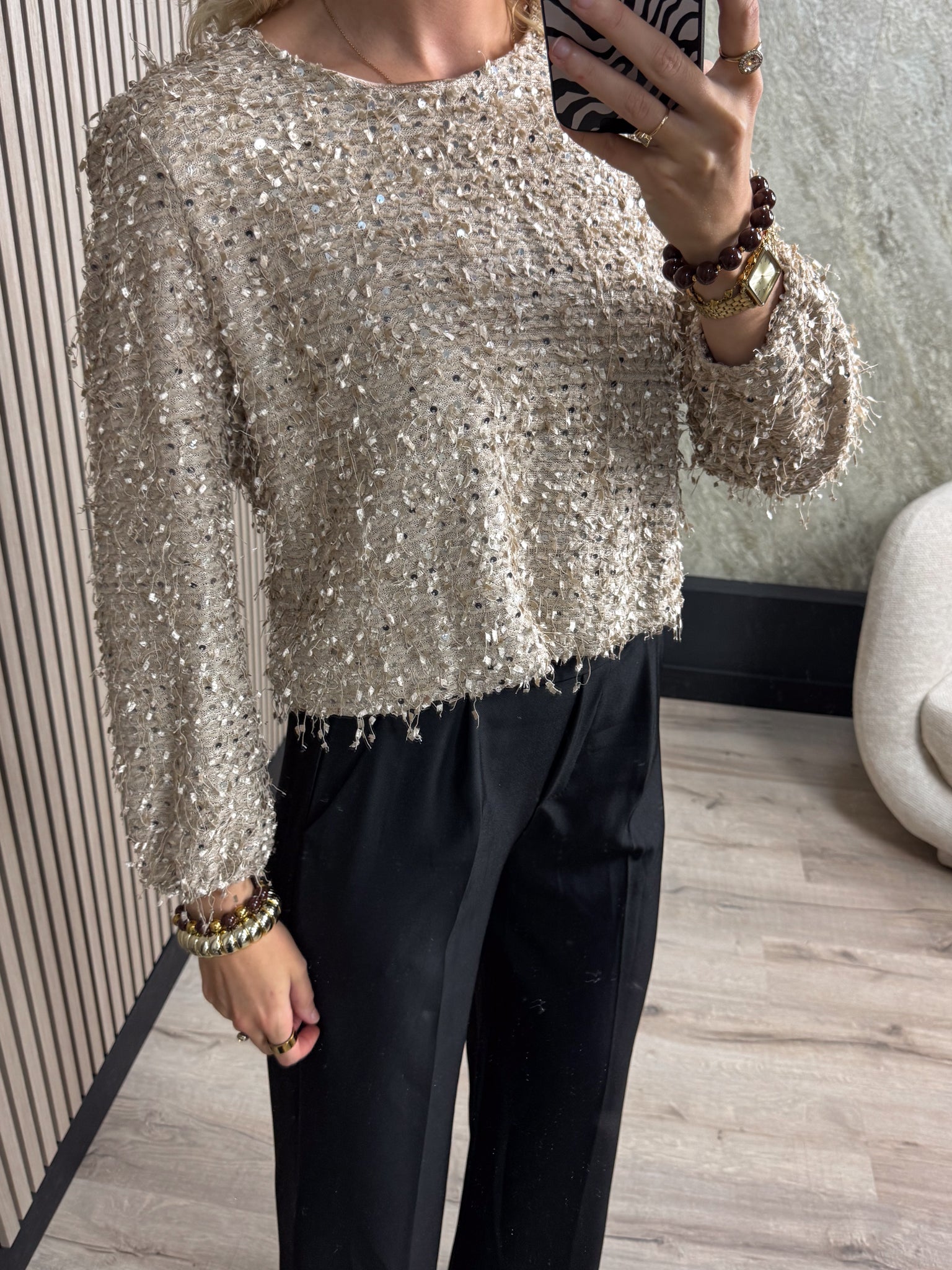 Deze top is een echte musthave. De top heeft een mooie ronde hals, sprankelende pailletten en een unieke verenstructuur. De top valt iets korter.