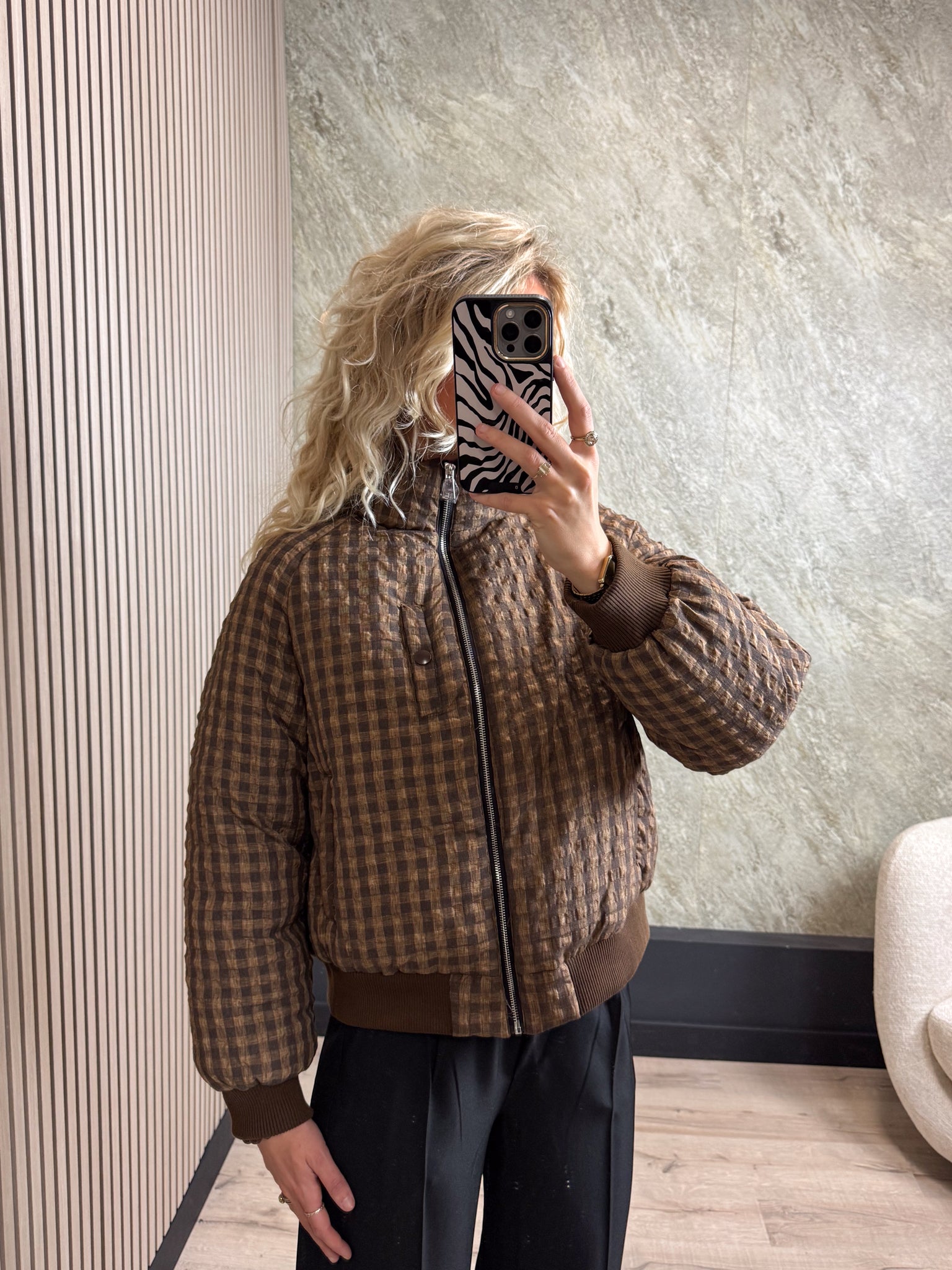 Deze jas is echt een musthave dit seizoen! De mooie blokjesprint en warme bruine trendkleur maken ‘m supermakkelijk te combineren. Stijlvol, comfy en perfect voor de koudere dagen.