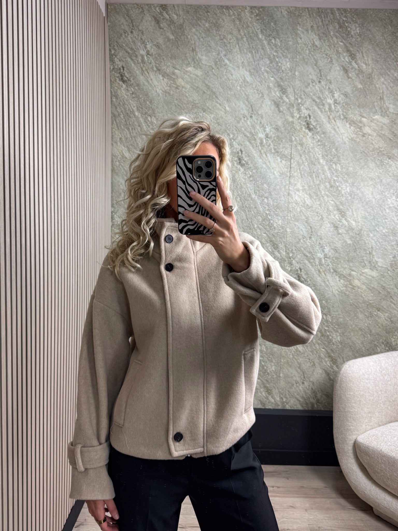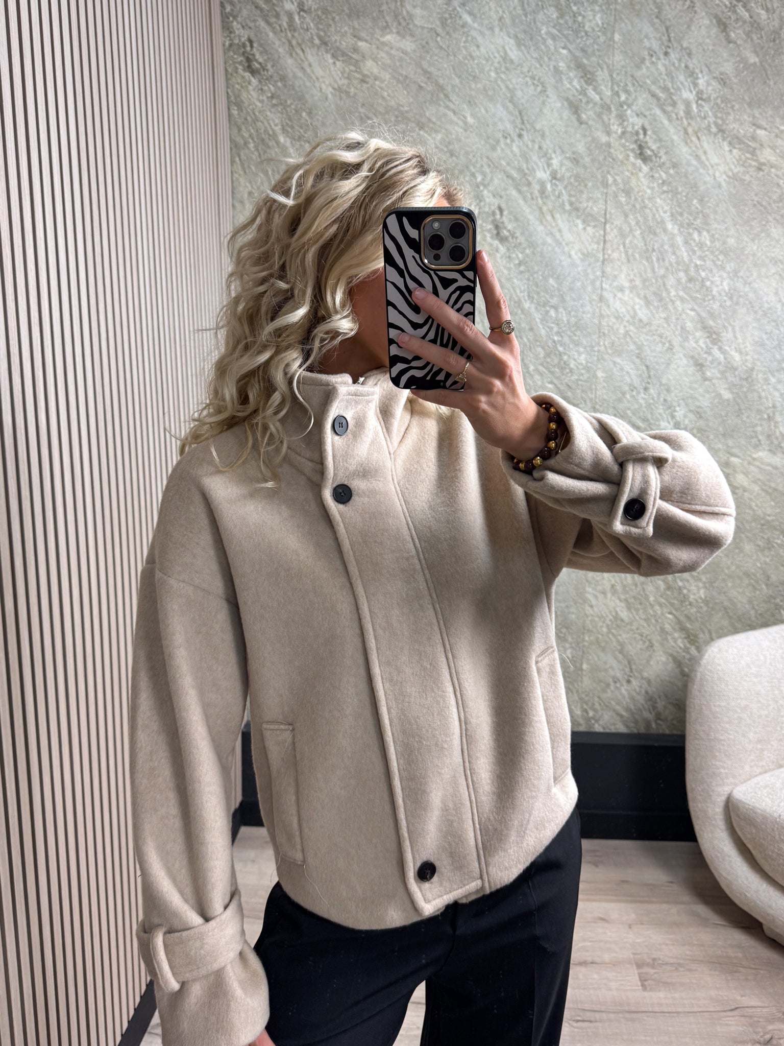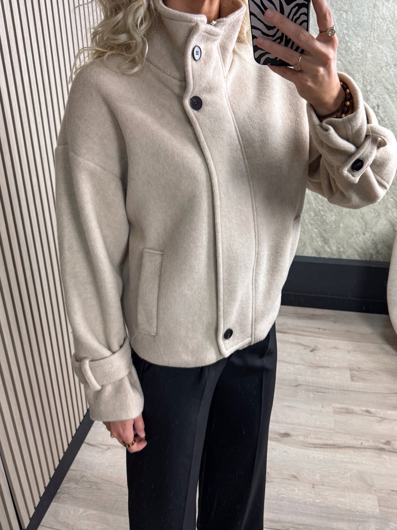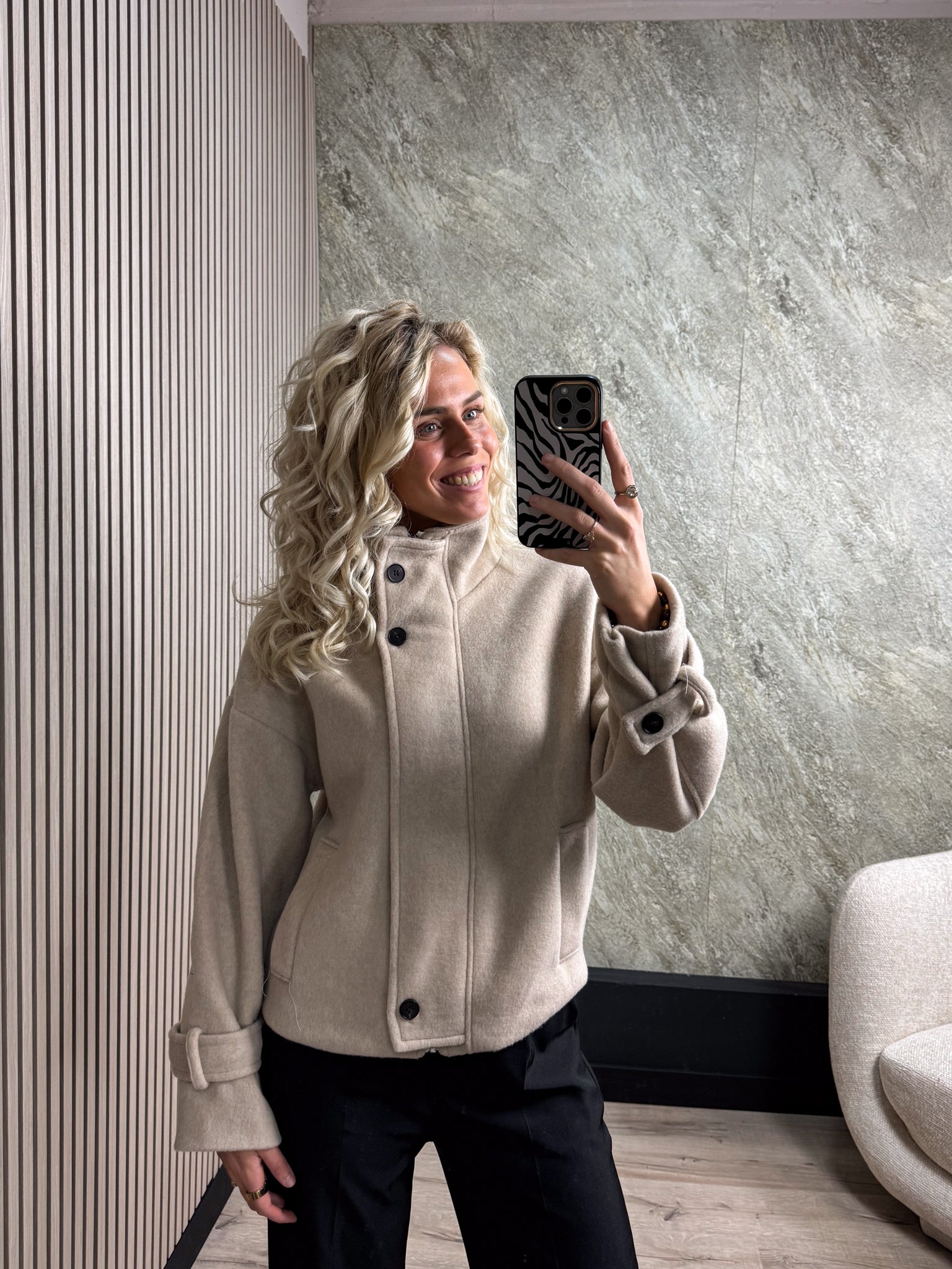 Deze jas is een echte eyecatcher. Hij is gemaakt van een warme, zachte stof en heeft een mooie hoge hals met leuke details aan de mouwen. Perfect om stijlvol én comfortabel de deur uit te gaan.