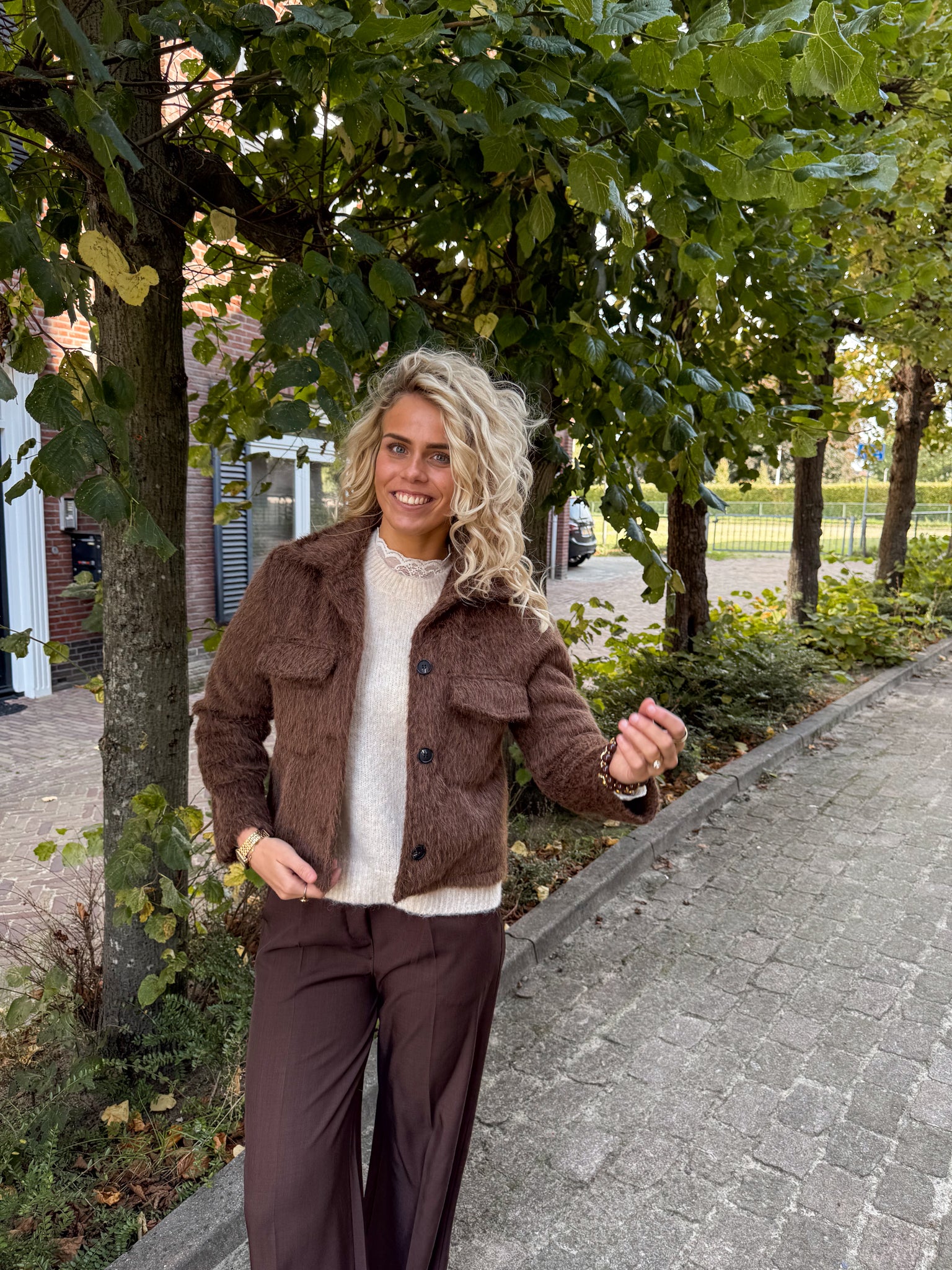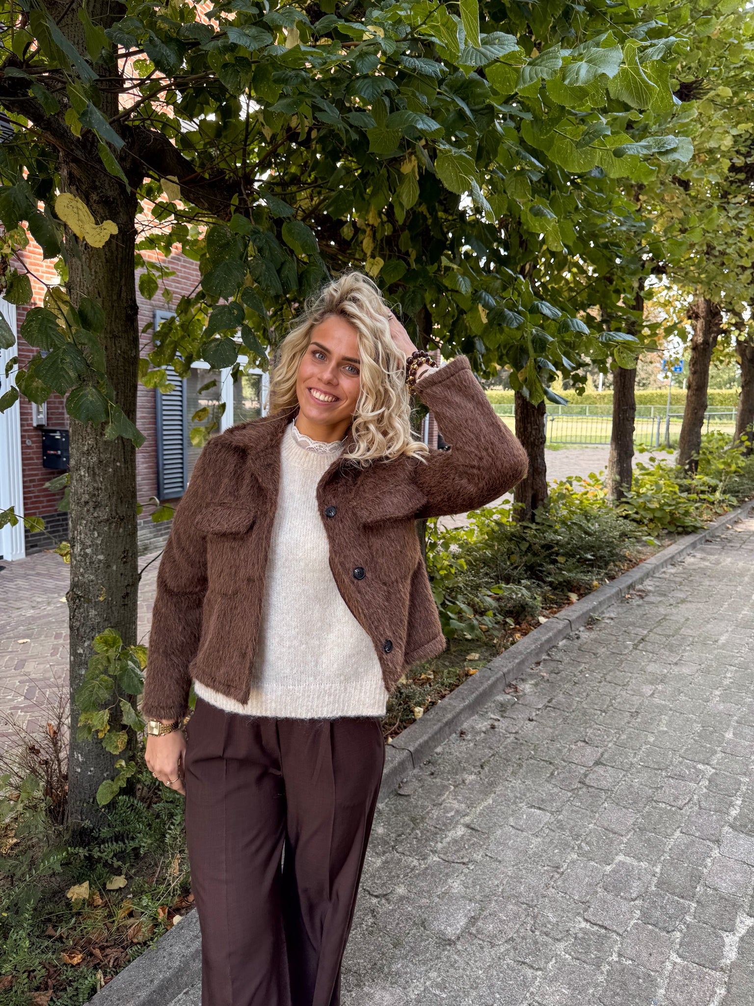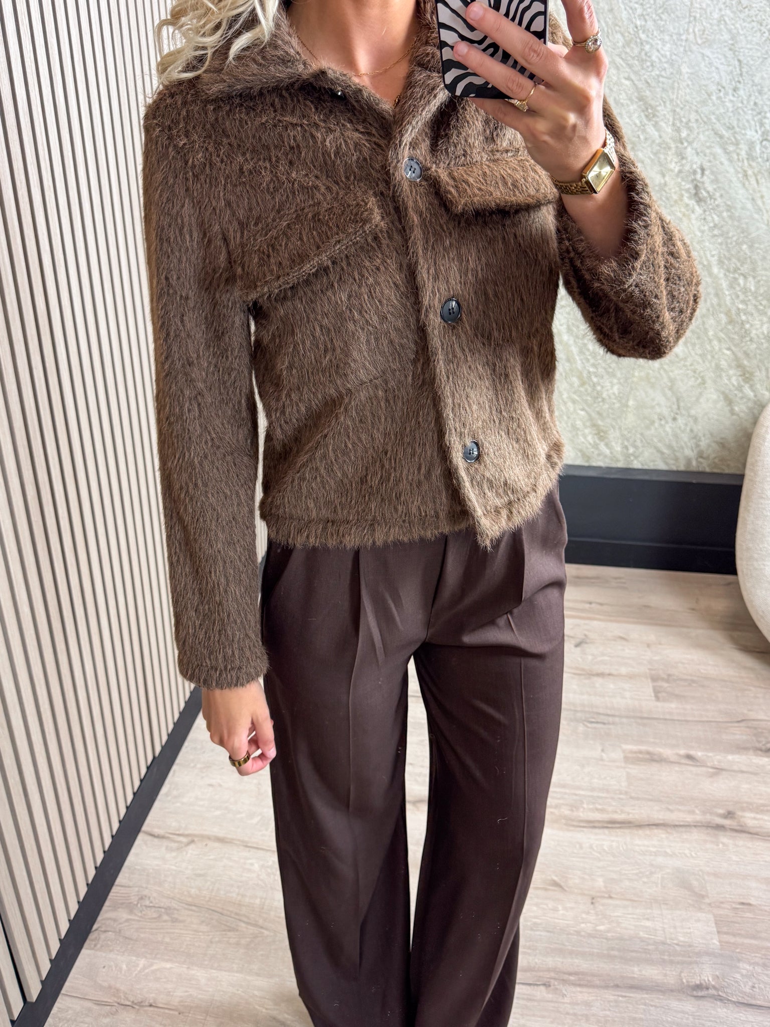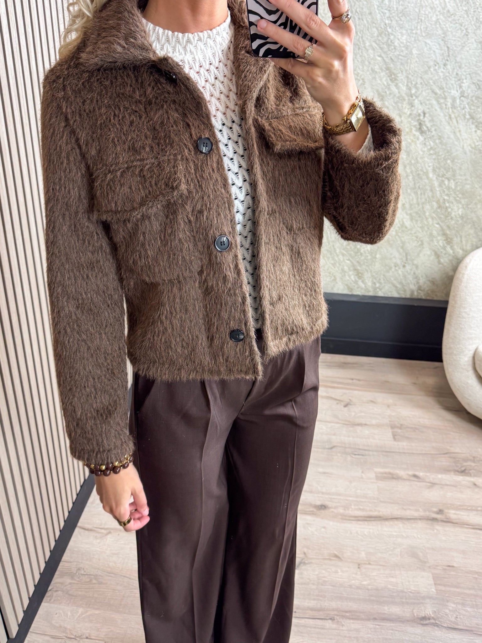 Dit stijlvolle jasje is een echte musthave! Het jasje heeft een harig structuur en 2 zakjes aan de voorkant. Je kan het jasje ook dicht dragen met een knoopsluiting.
