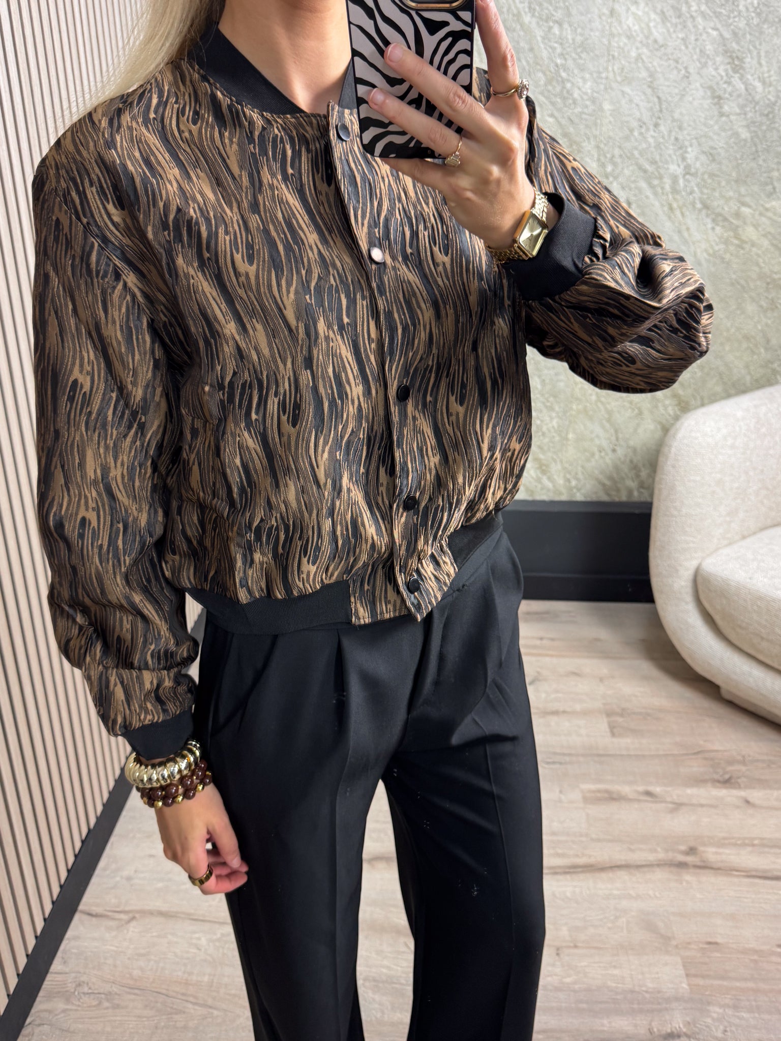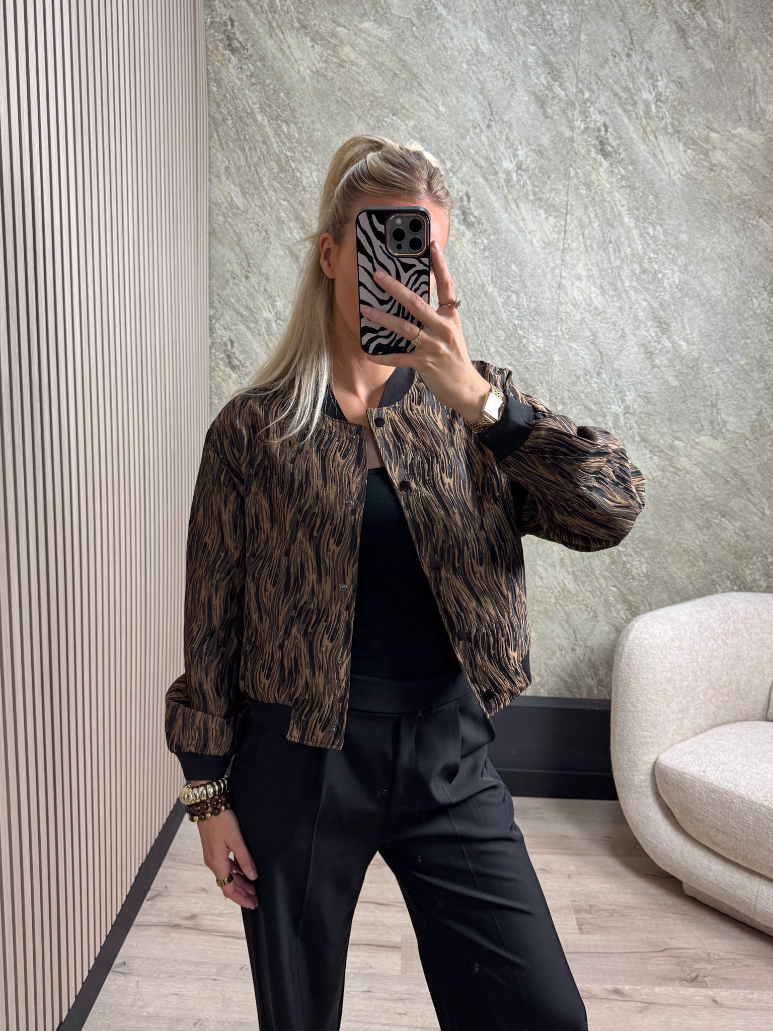 Dit stijlvolle jasje is een echte musthave! De bomberstijl en de speelse print geven je outfit een trendy touch. Het jasje sluit met drukknopen en heeft een comfortabele elastische band aan de onderkant.