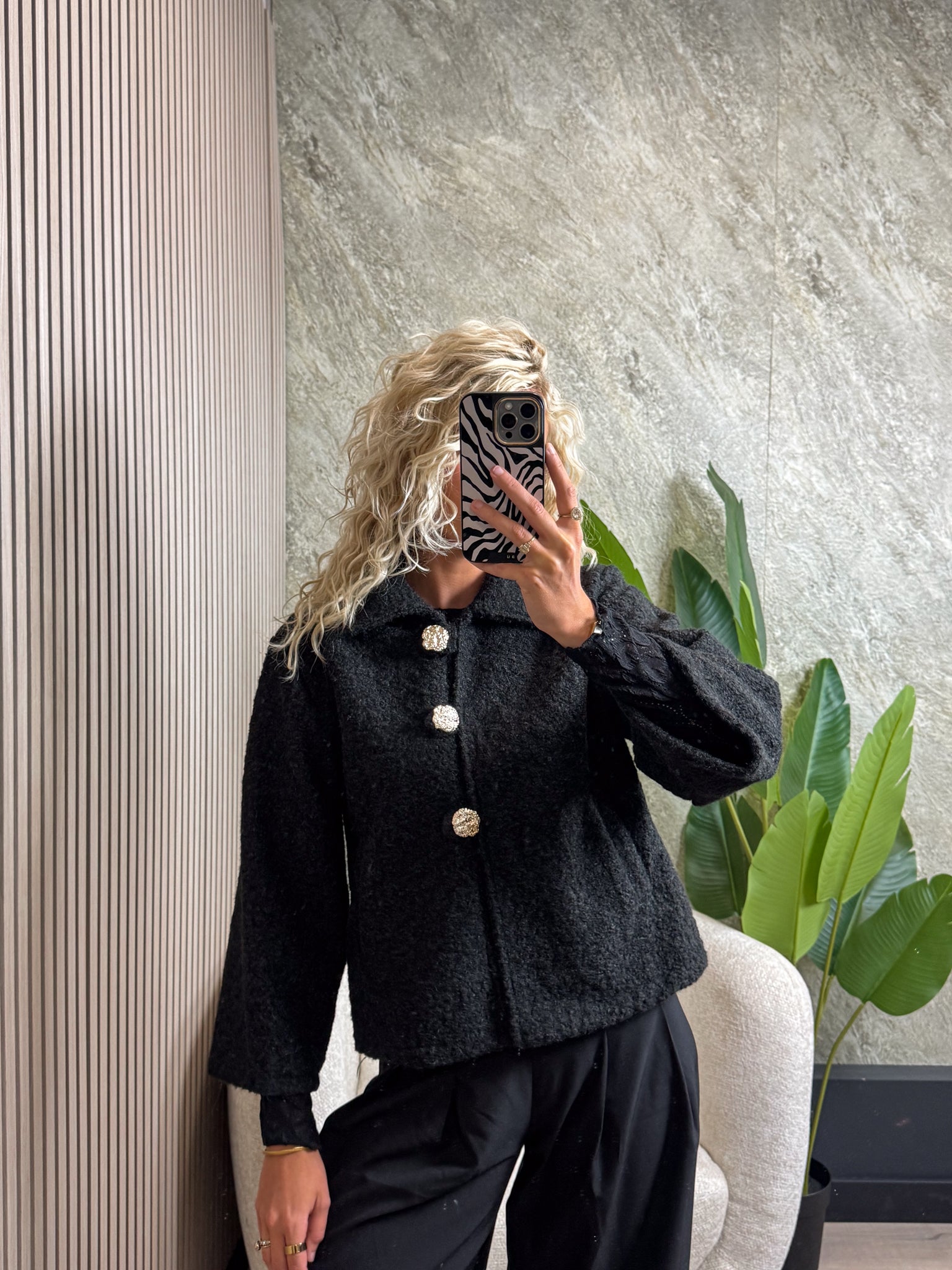 Dit stijlvolle jasje is een echte musthave! Met prachtige knopen en een elegante kraag geeft het je outfit direct een chique uitstraling. De iets kortere mouwen zorgen voor een trendy poncho-look.