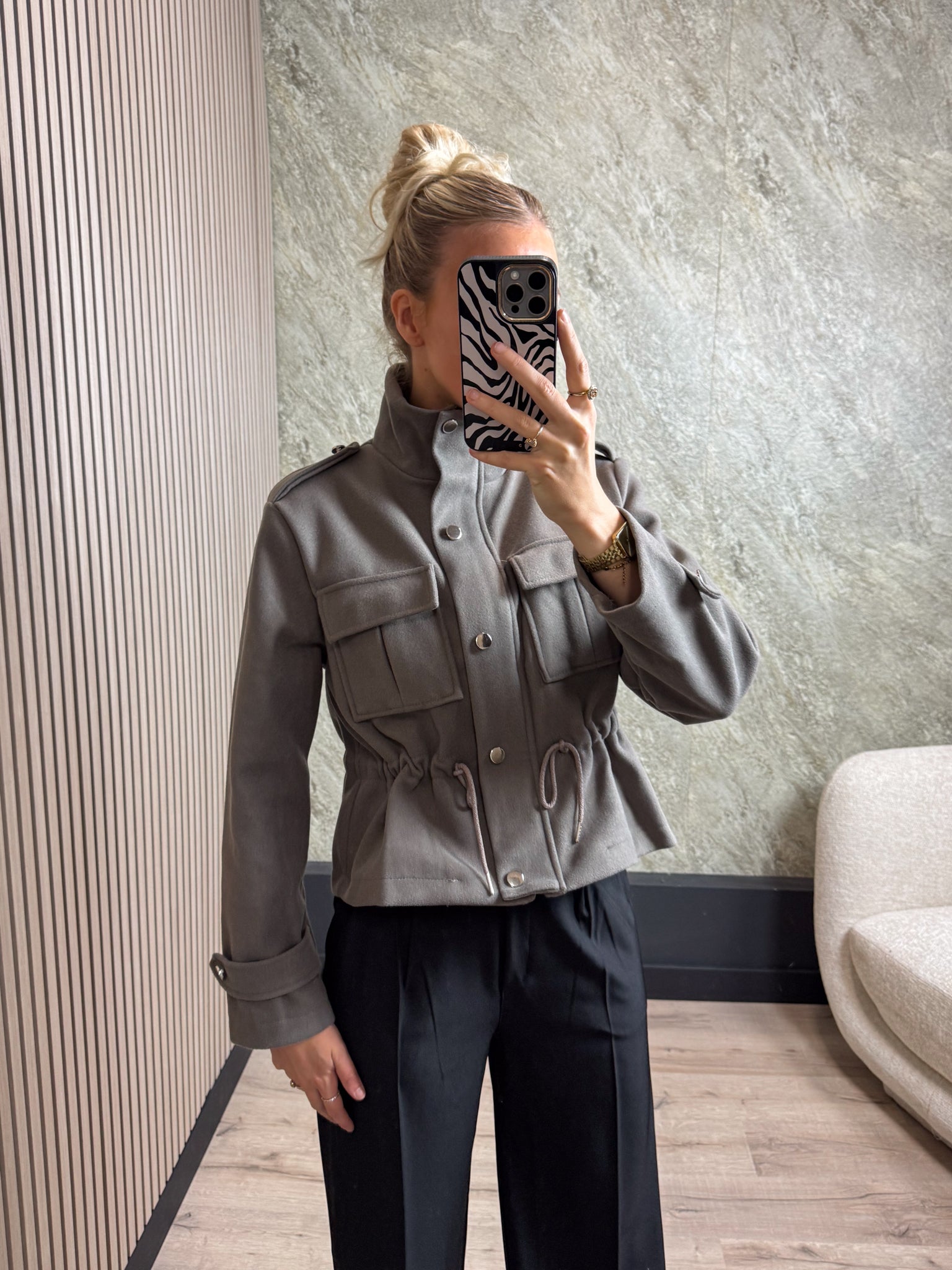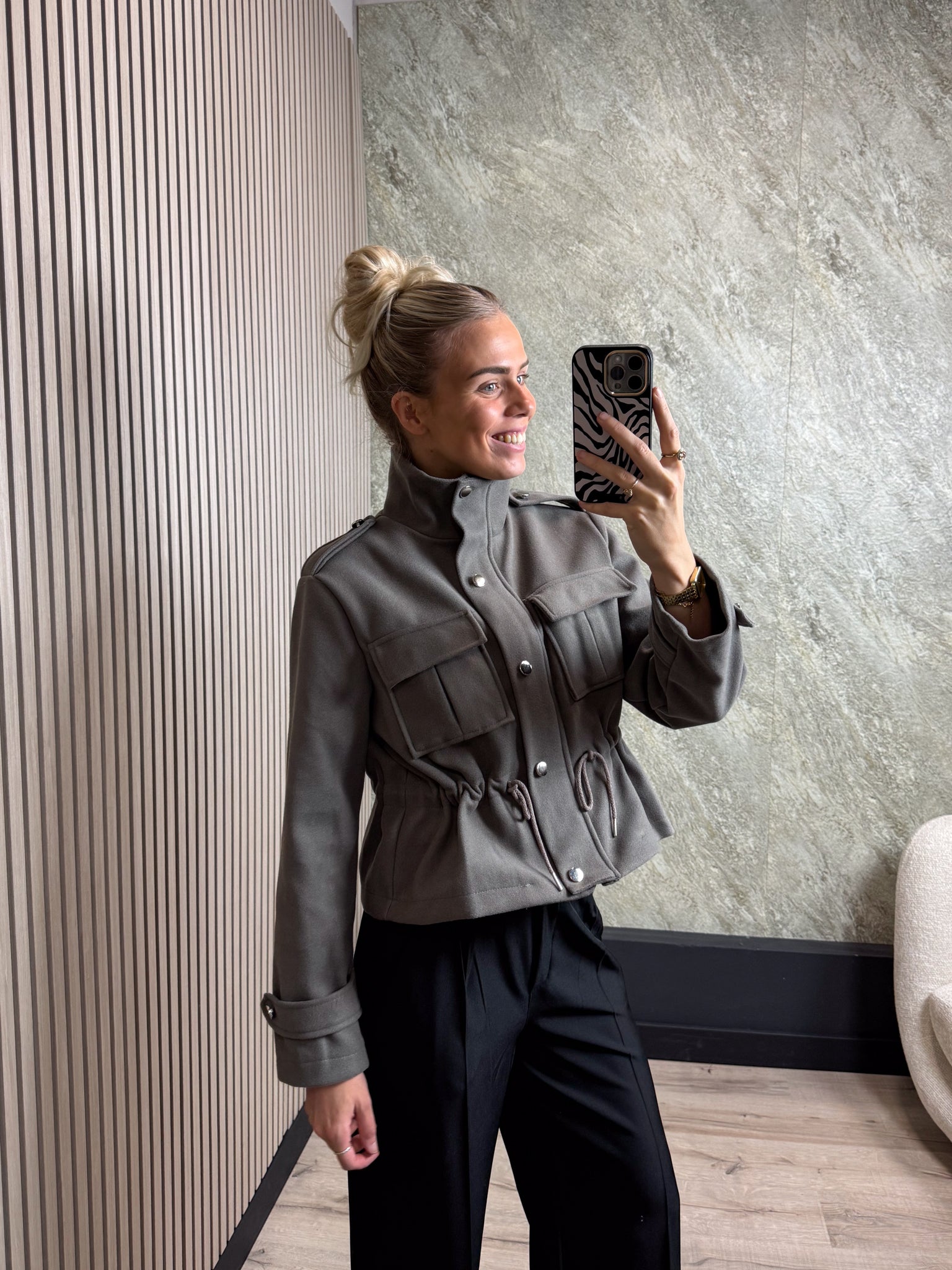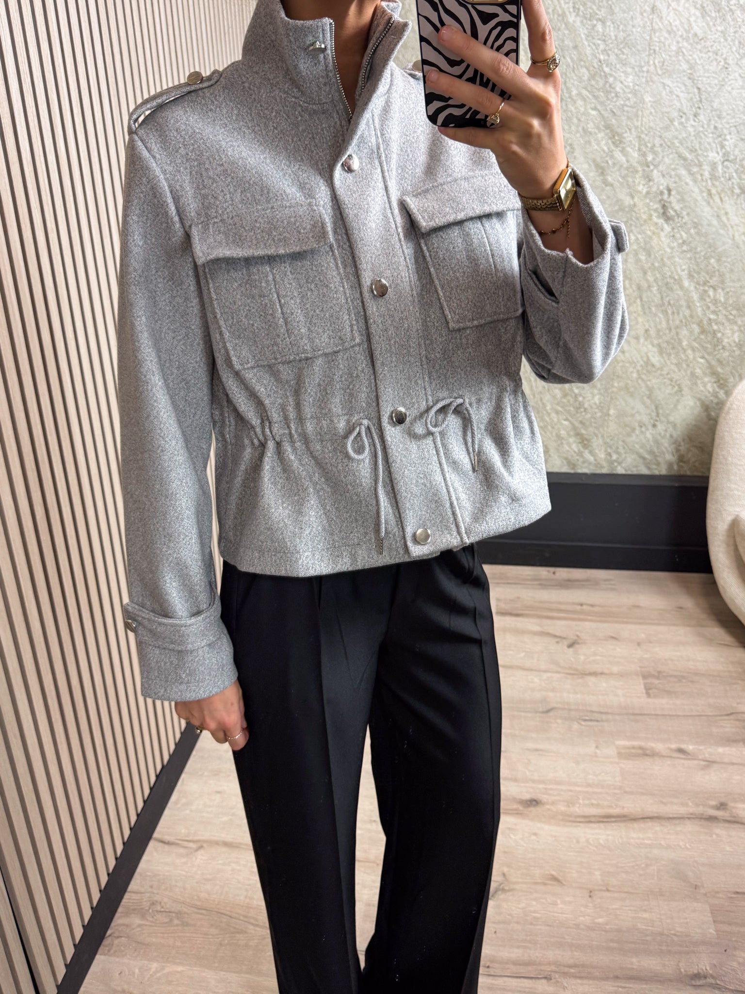Dit jasje is een echte musthave! Het is gemaakt van een zachte stof en heeft een ritssluiting met mooie knoopdetails. In de taille kun je het jasje aansnoeren voor een mooie pasvorm. Op de voorkant zitten twee klepzakken die de look compleet maken.