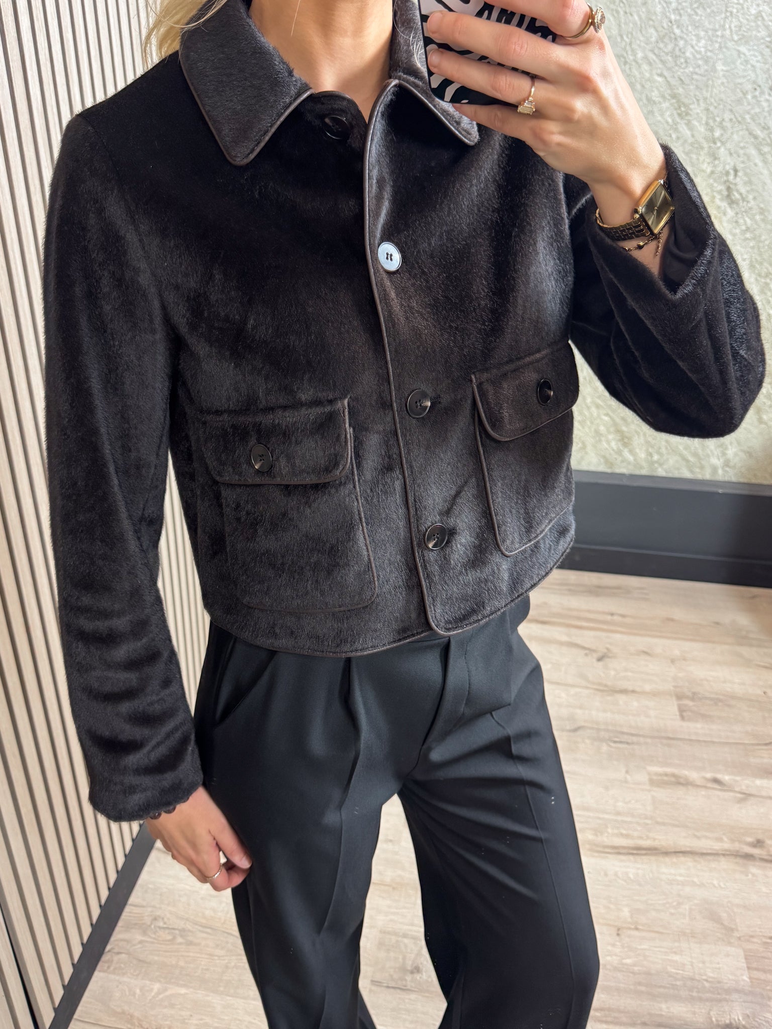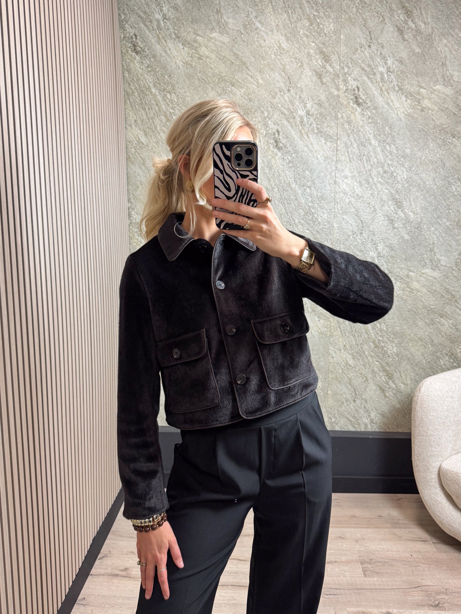 Dit stijlvolle jasje is een echte musthave! Het is gemaakt van een zachte, harige stof en afgewerkt met verfijnde leren stiksels. Je. kunt het zowel binnen als buiten dragen, perfect voor elke gelegenheid.