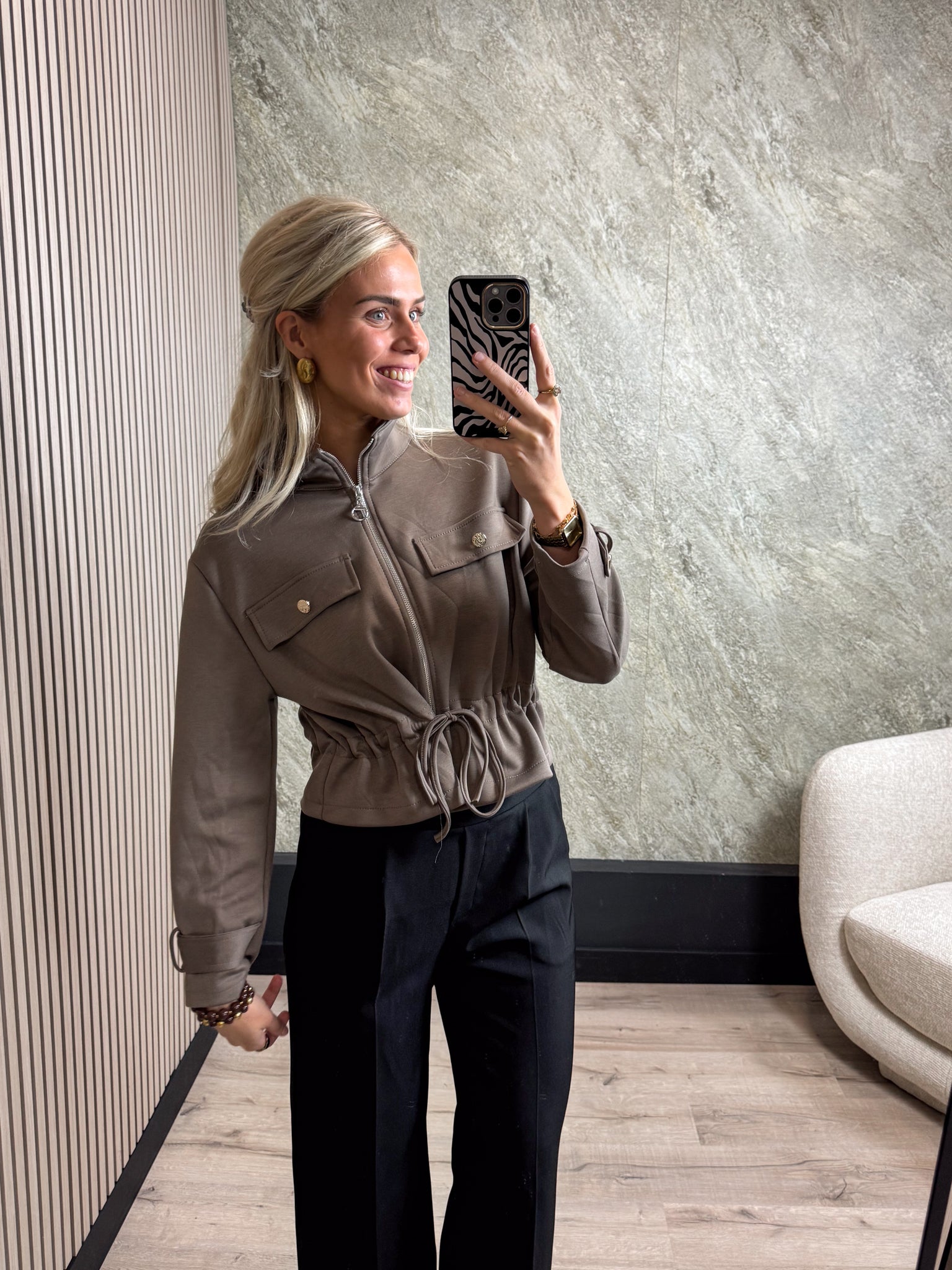 Dit jasje is een echte must-have! Het is gemaakt van een heerlijk comfortabele stof, heeft een ritssluiting en kan in de taille mooi worden aangetrokken.