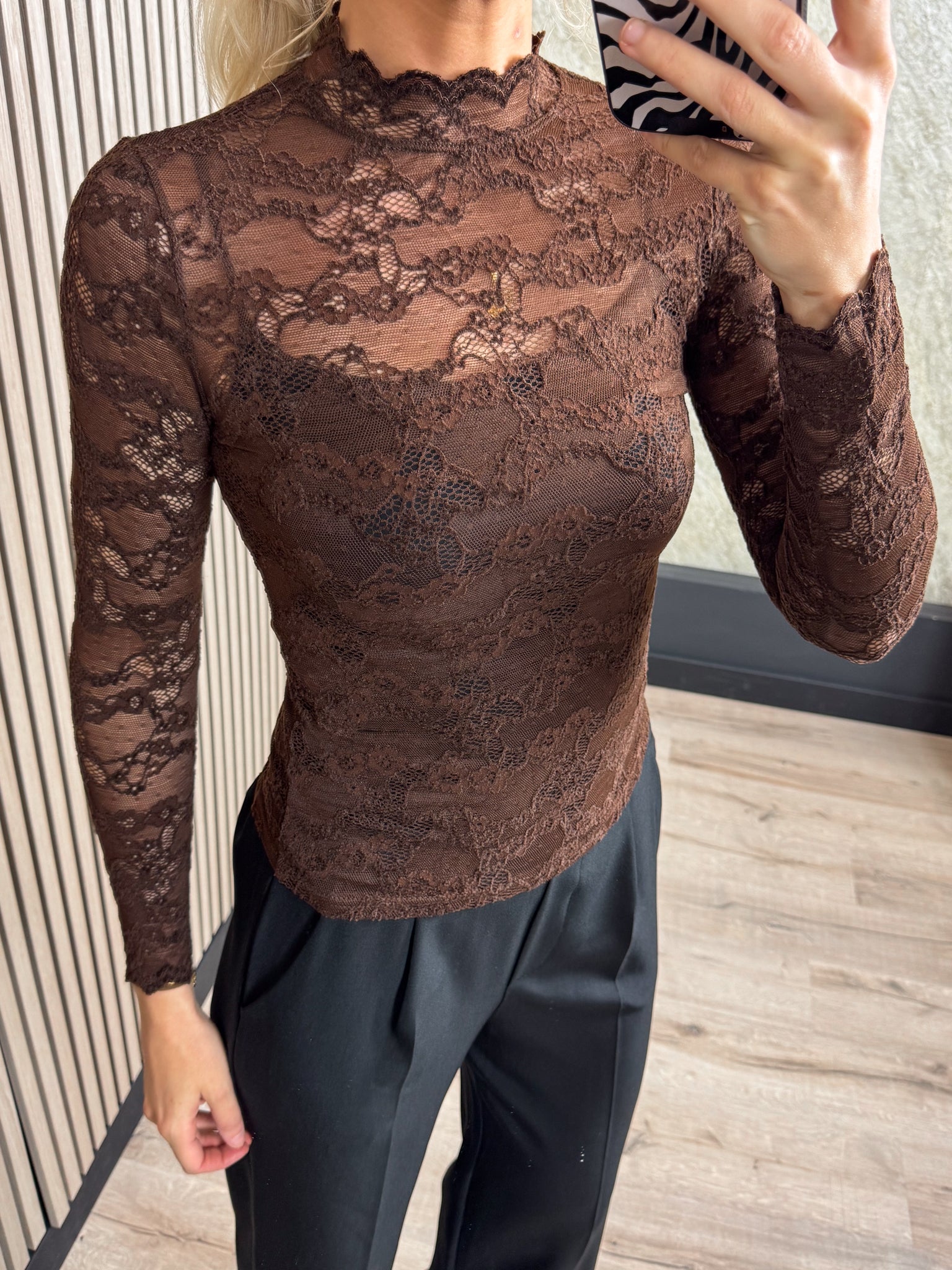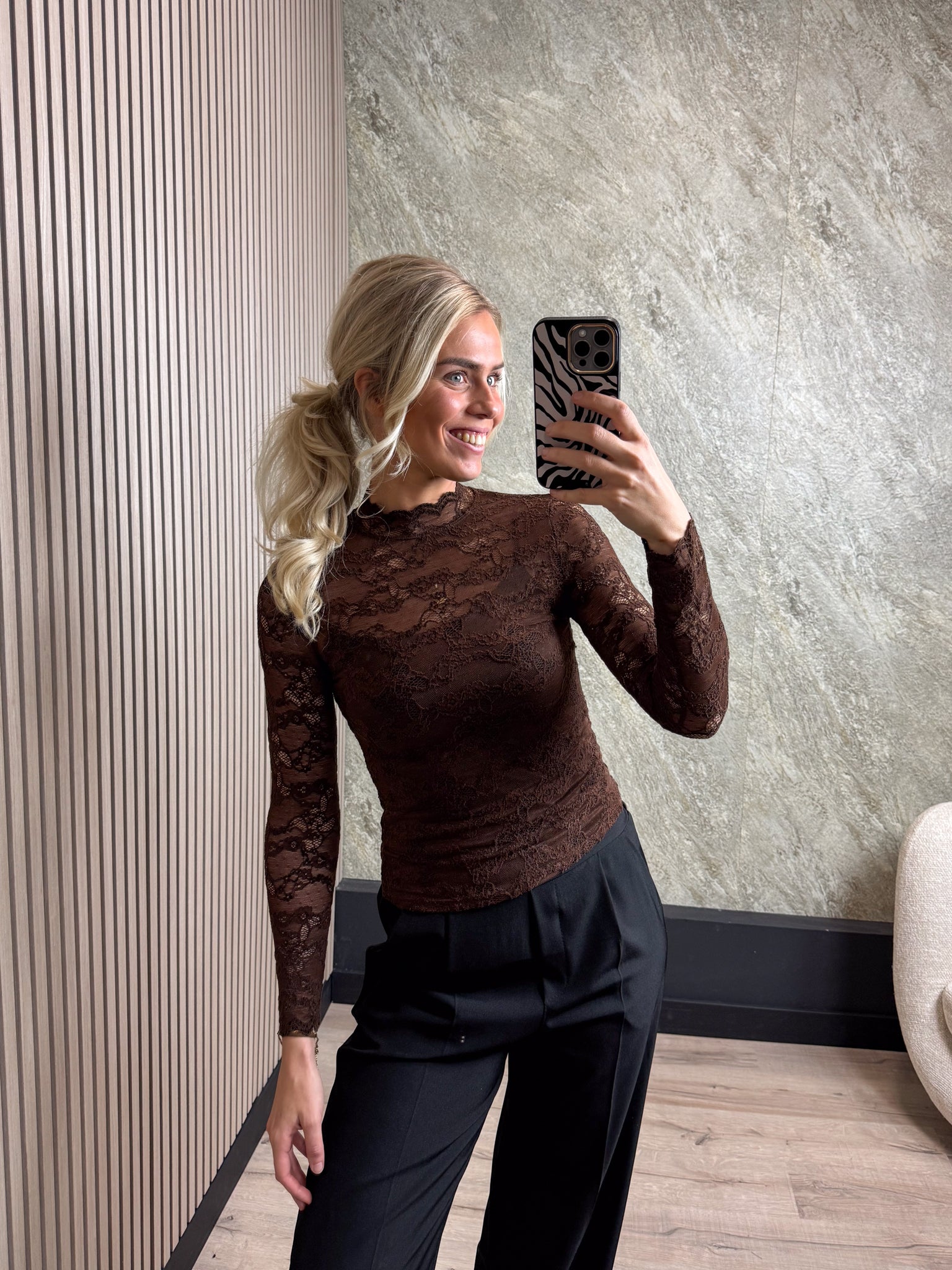 Deze kantentop is een echte musthave! De top heeft een mooie hoge hals en is perfect om dit najaar in laagjes te combineren voor een trendy look.