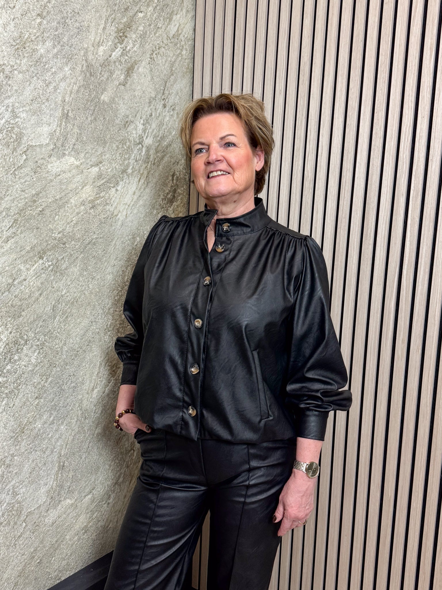 Dit jasje heeft een stoere lederlook stijl. Het ballonmodel met pofmouwen en een prachtige knoopsluiting maakt het helemaal af. Superleuk te combineren met onze bijpassende lederlook broek.