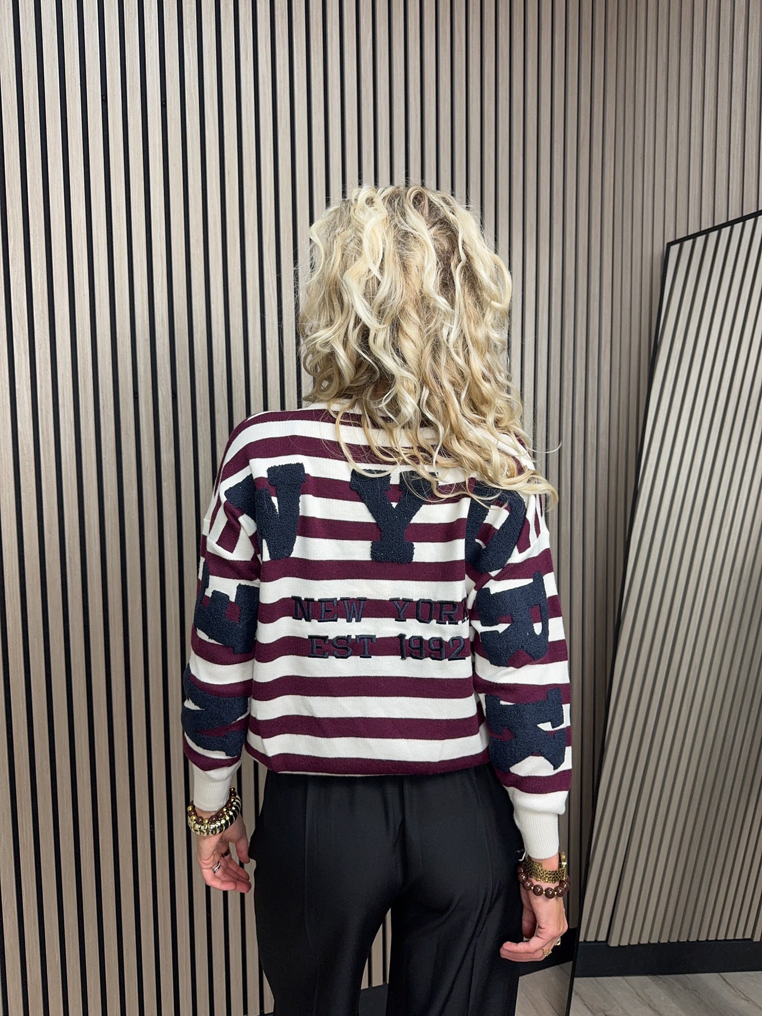 Deze trui is een echte musthave voor dit najaar. De trui heeft een stijlvolle strepenprint en op de rug staat de tekst ‘New York’ in zachte teddyletters.