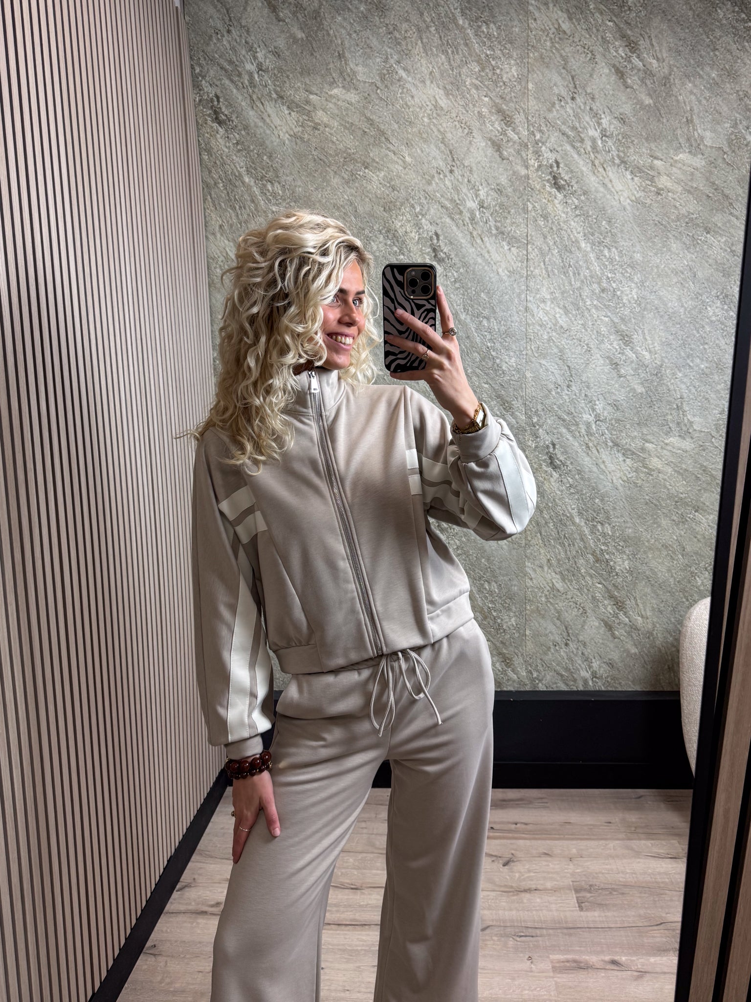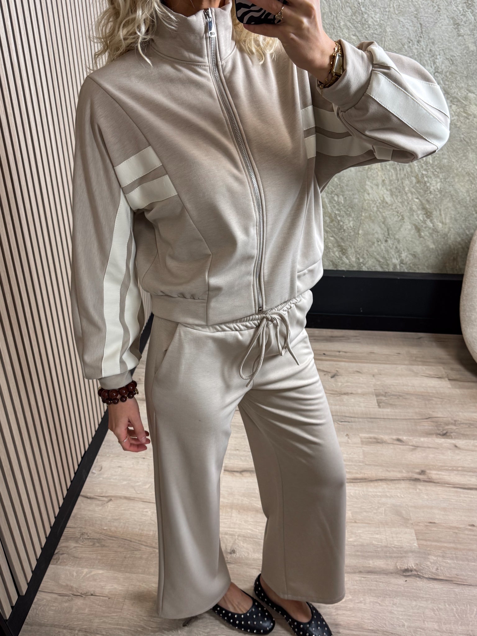 Deze set is een echte musthave! Het sportieve jasje en de bijpassende broek met iets wijde pijpen zorgen voor een comfortabele en stijlvolle look. Gemaakt van zachte stof.
