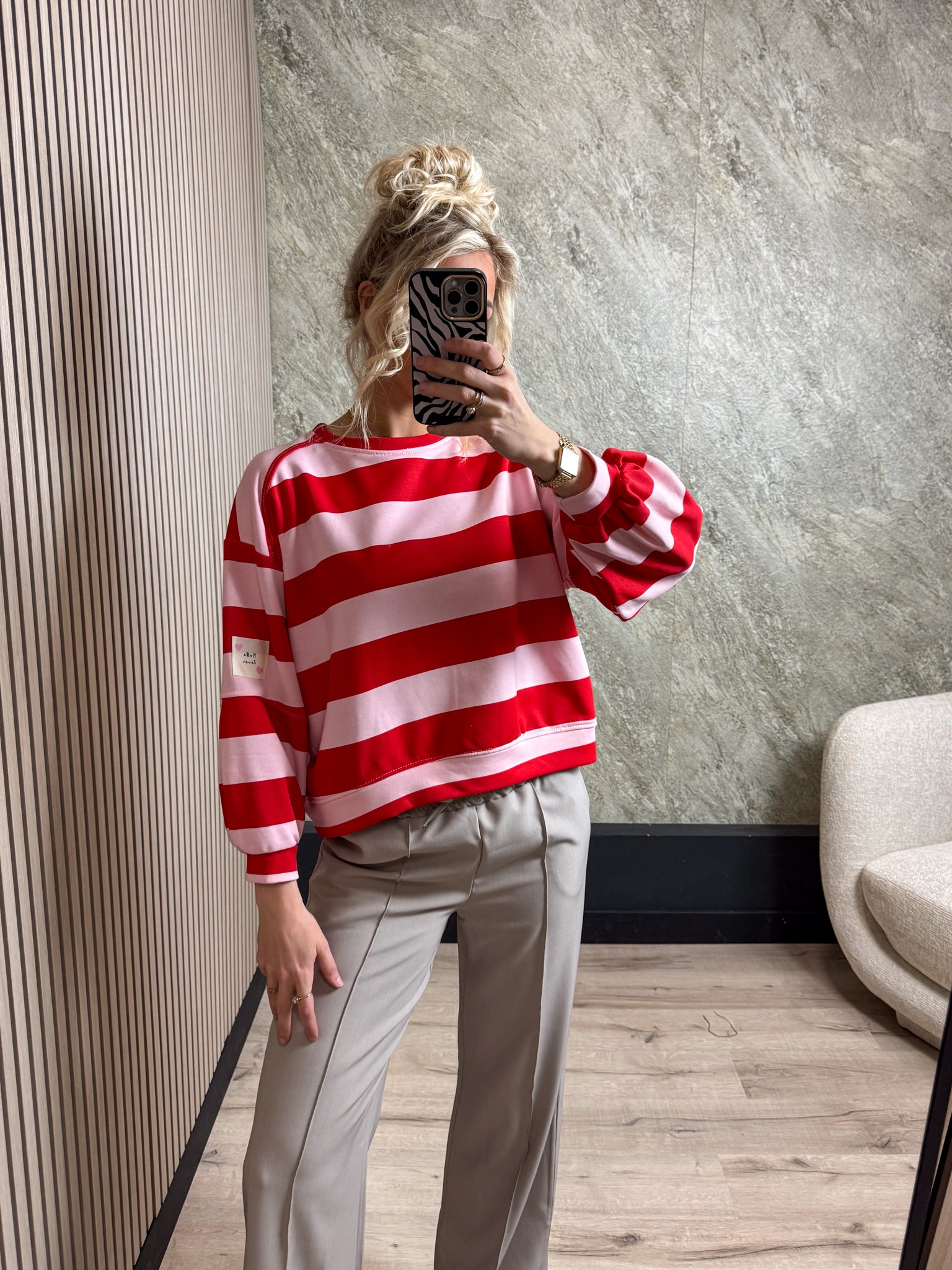 Deze sweater is een echte eyecatcher. Hij heeft een mooie ronde hals, een trendy strepenprint en een leuk klein detail op de mouw.
