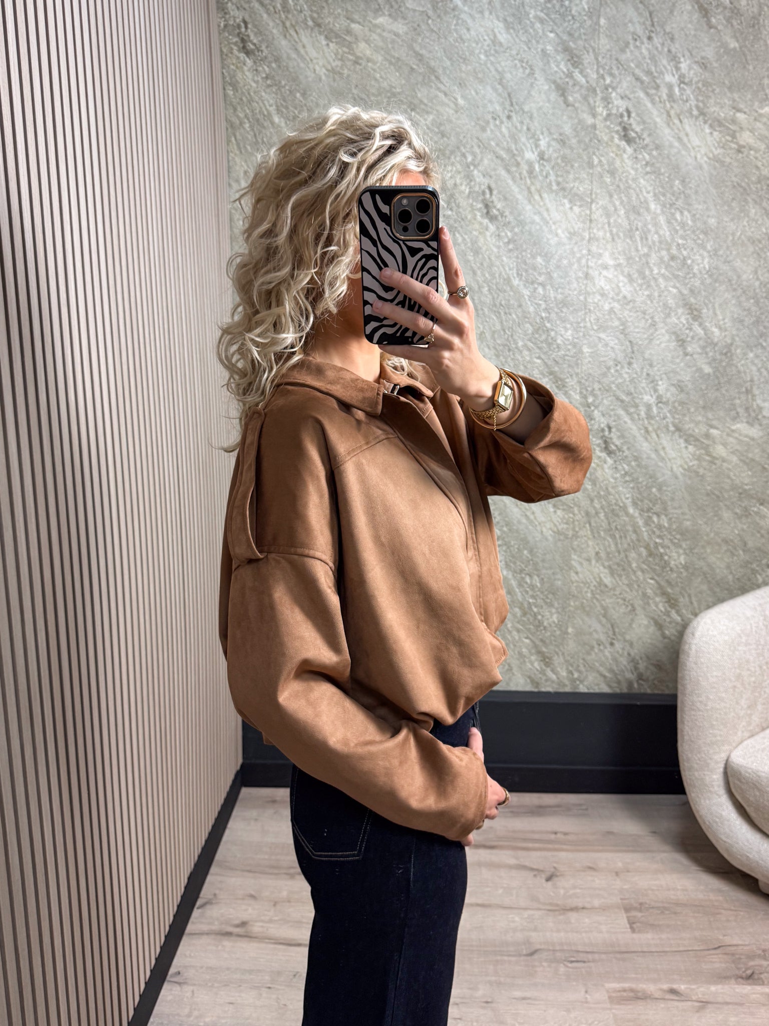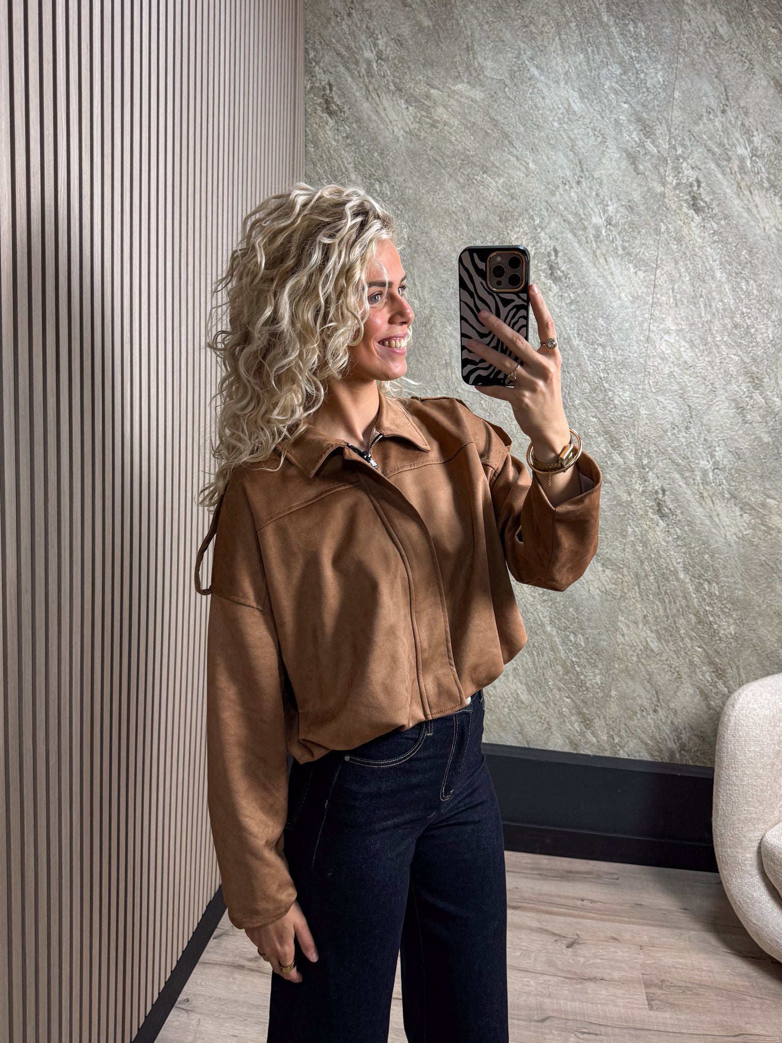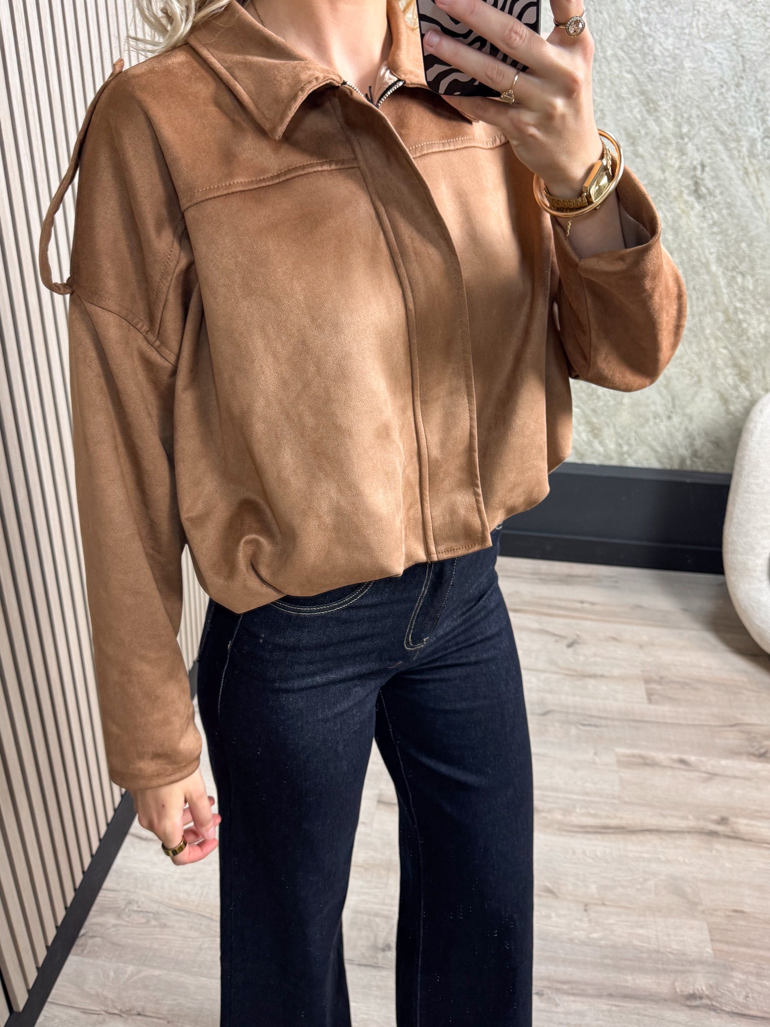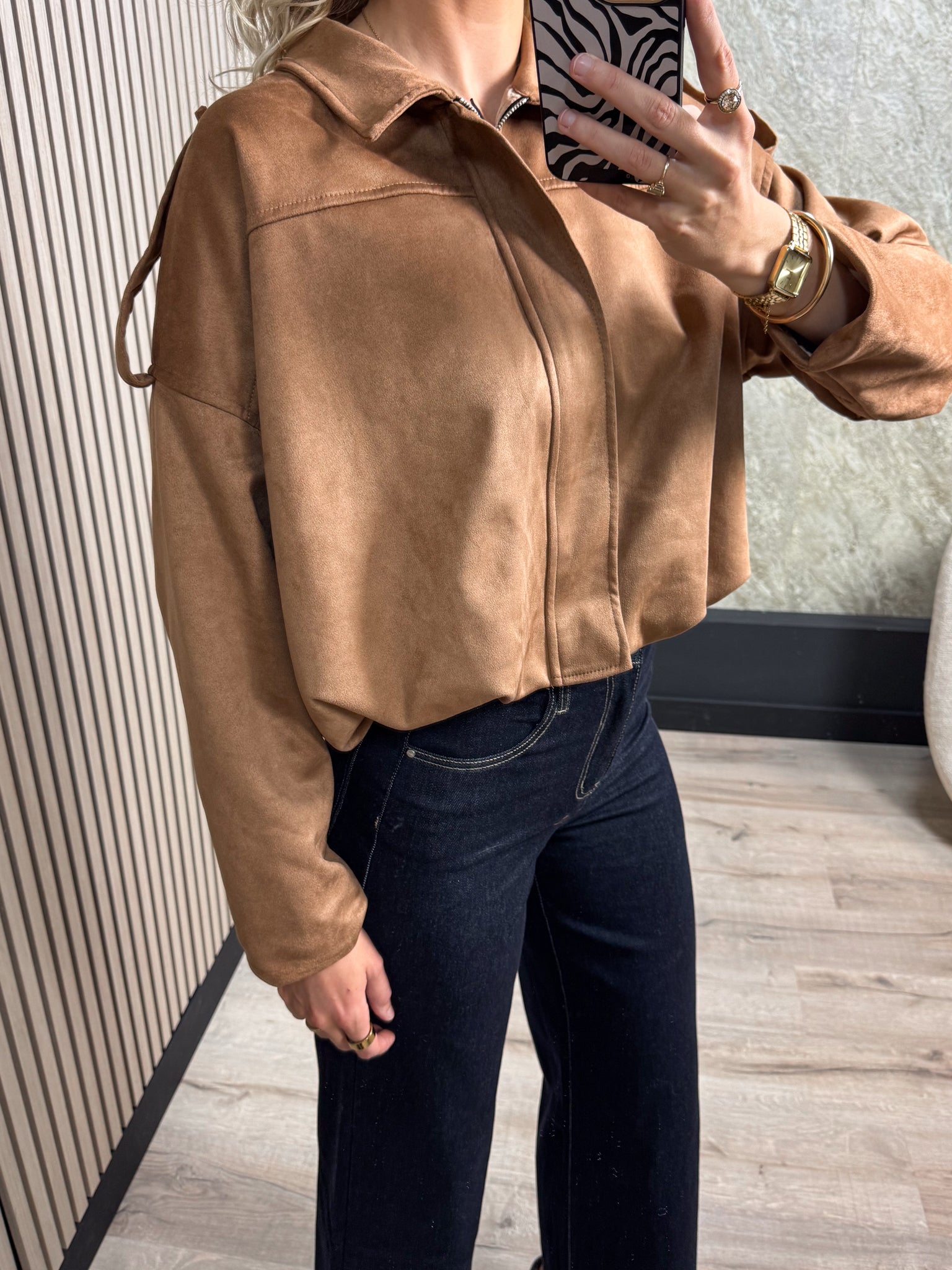 Deze suède jas is een echte musthave! Het jasje heeft een kort model en een handige ritssluiting.