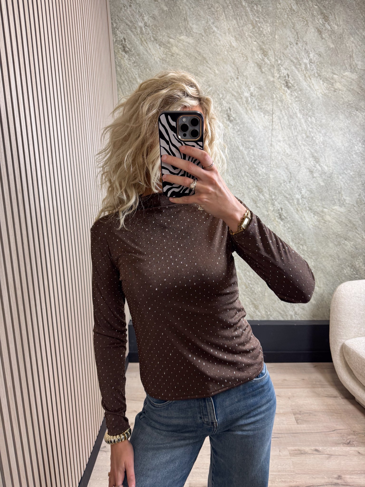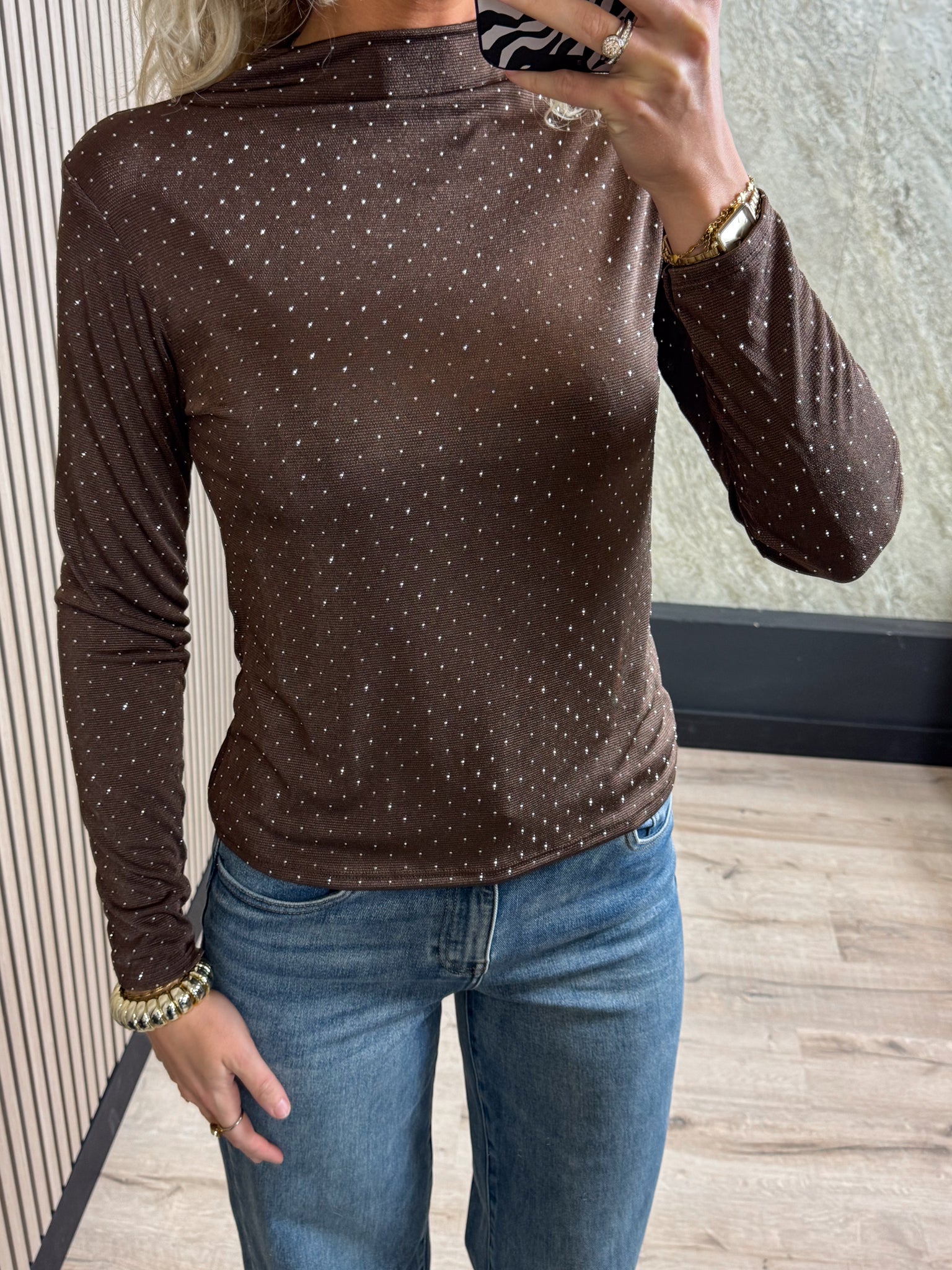 Deze prachtige glitter top is een echte musthave voor dit najaar! De top heeft een elegante hoge hals en is perfect te combineren met een blazer voor een stijlvolle look.