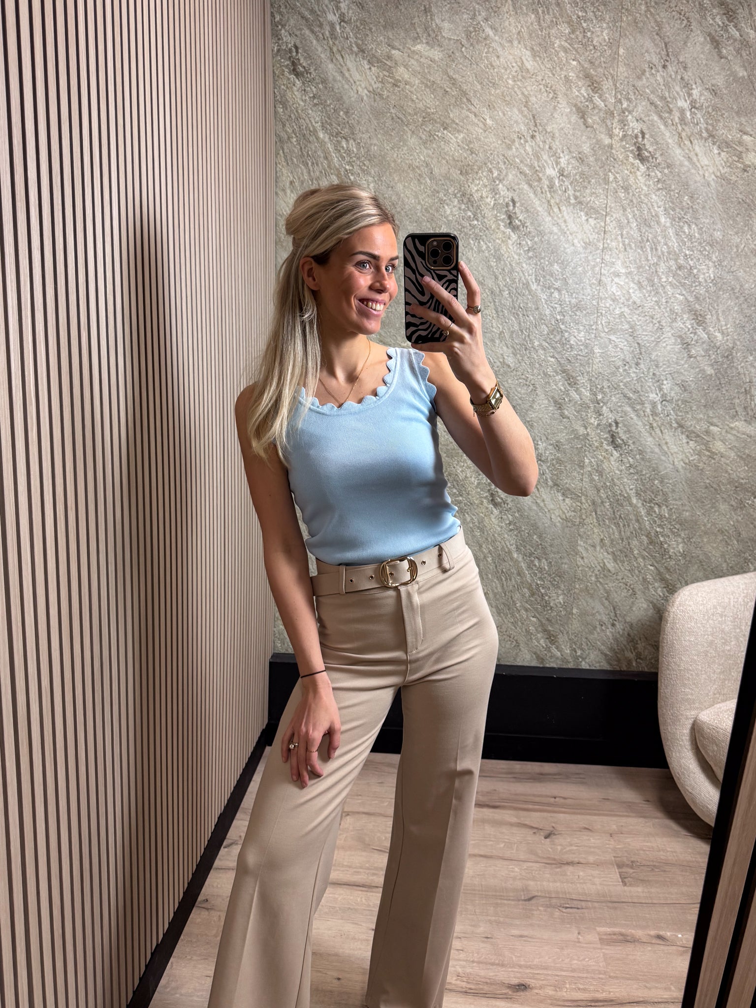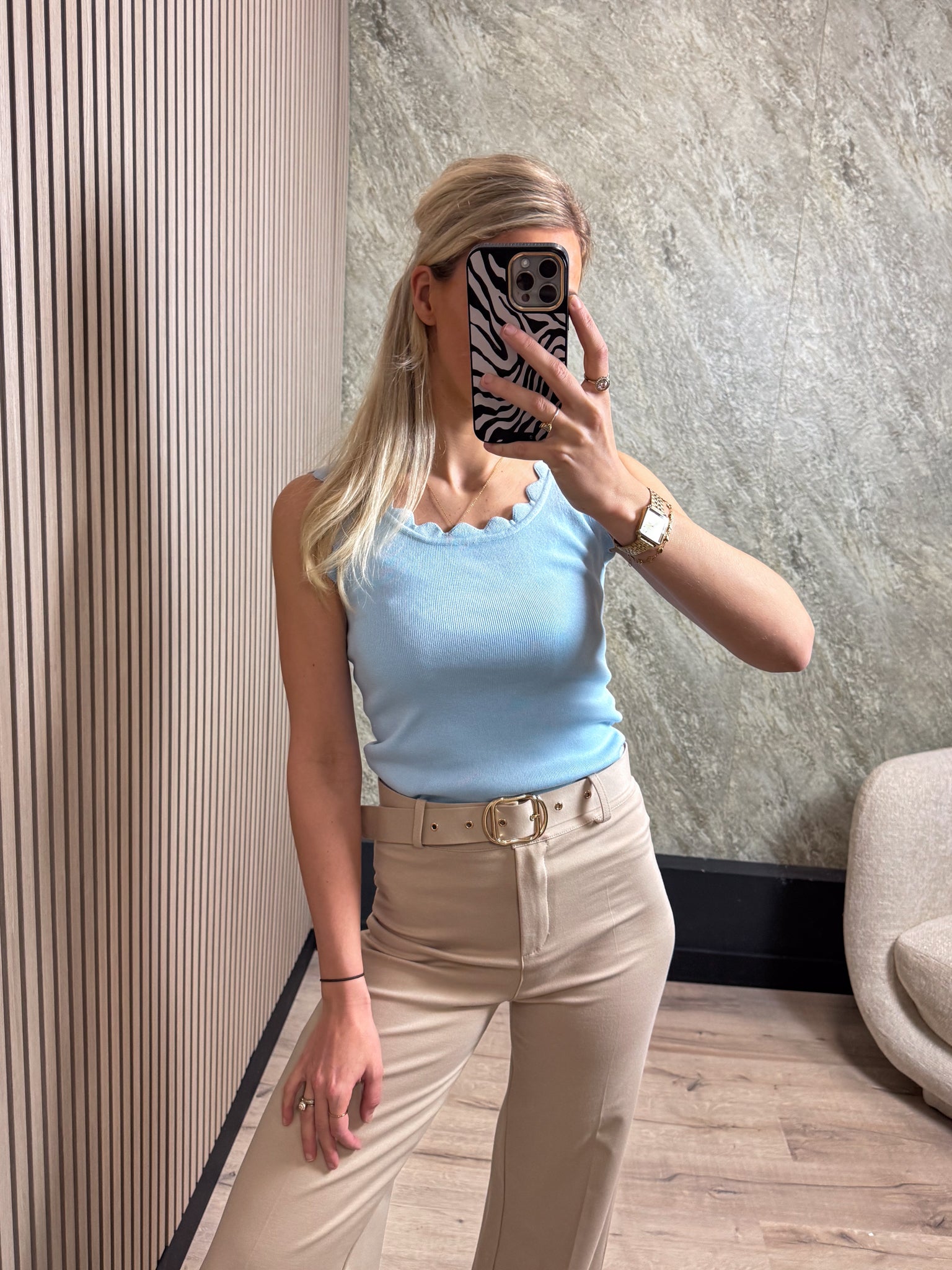 Deze top is een echte eyecatcher. De top heeft een leuke kartelhals en is perfect om te dragen onder een blazer of jasje.