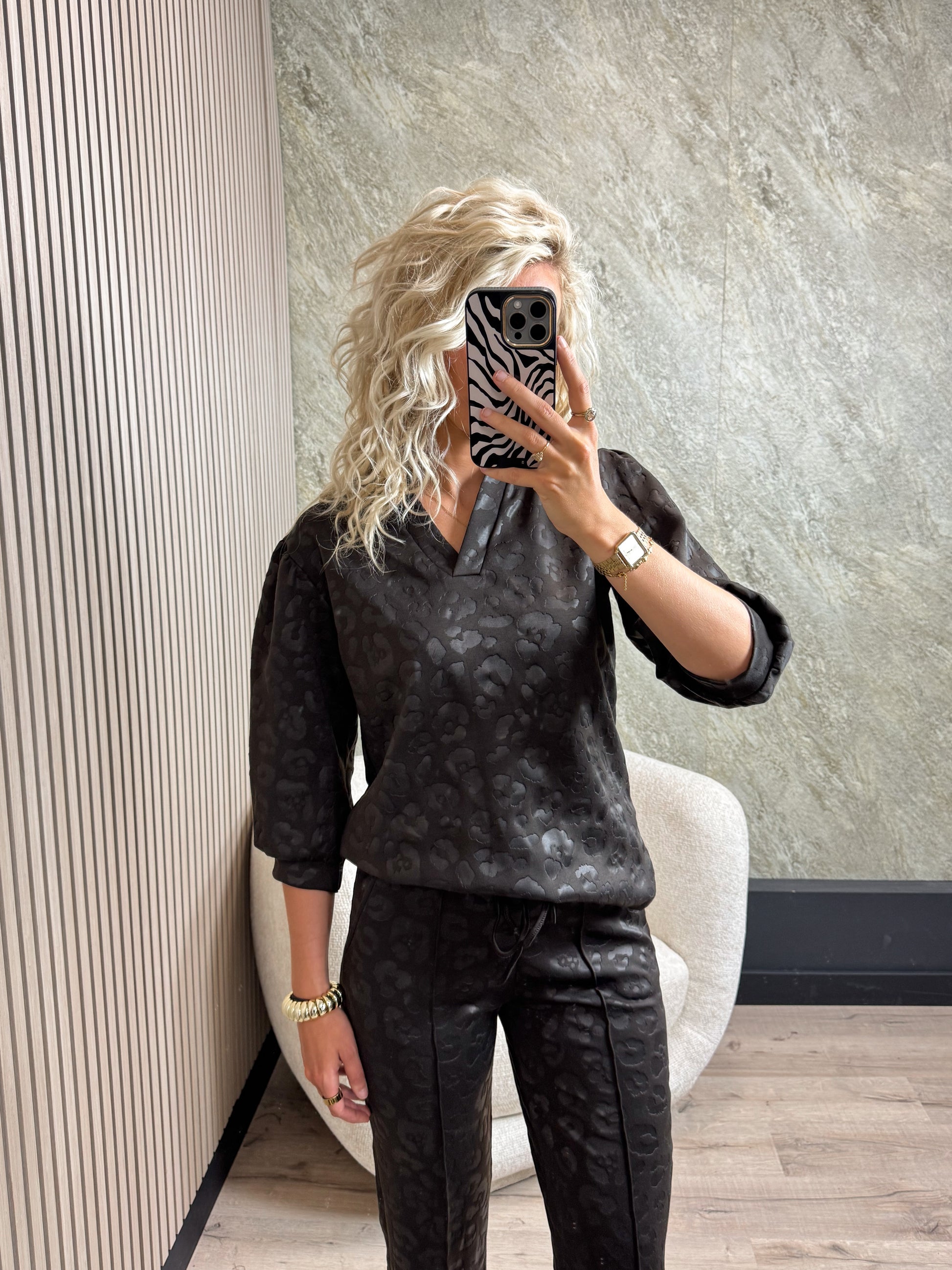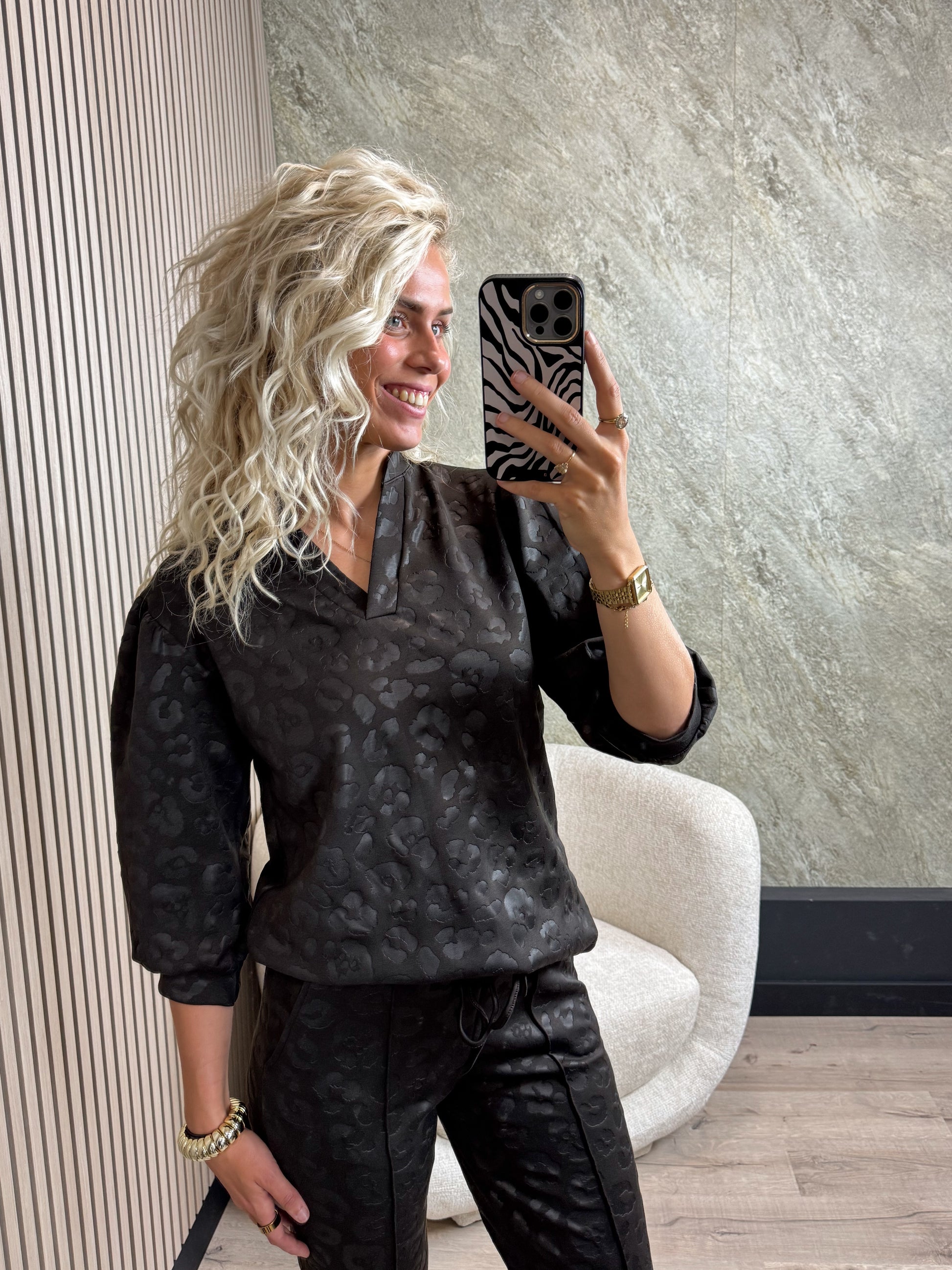 Deze stijlvolle top heeft een prachtige panterstructuur. De top is voorzien van elegante driekwart mouwen met een subtiele pofmouw. Superleuk te combineren met de bijpassende broek 'Isa'.