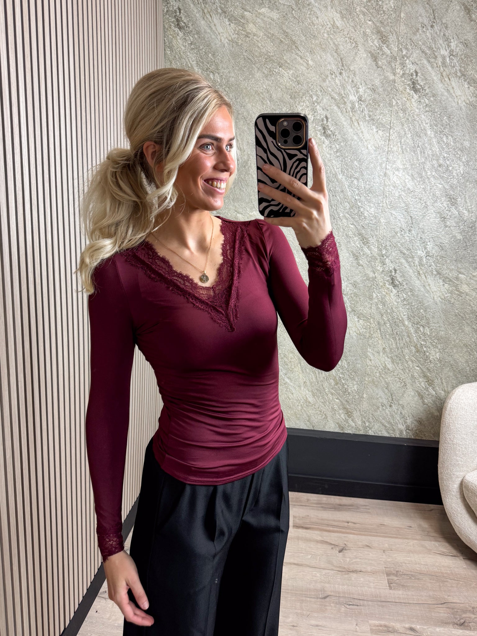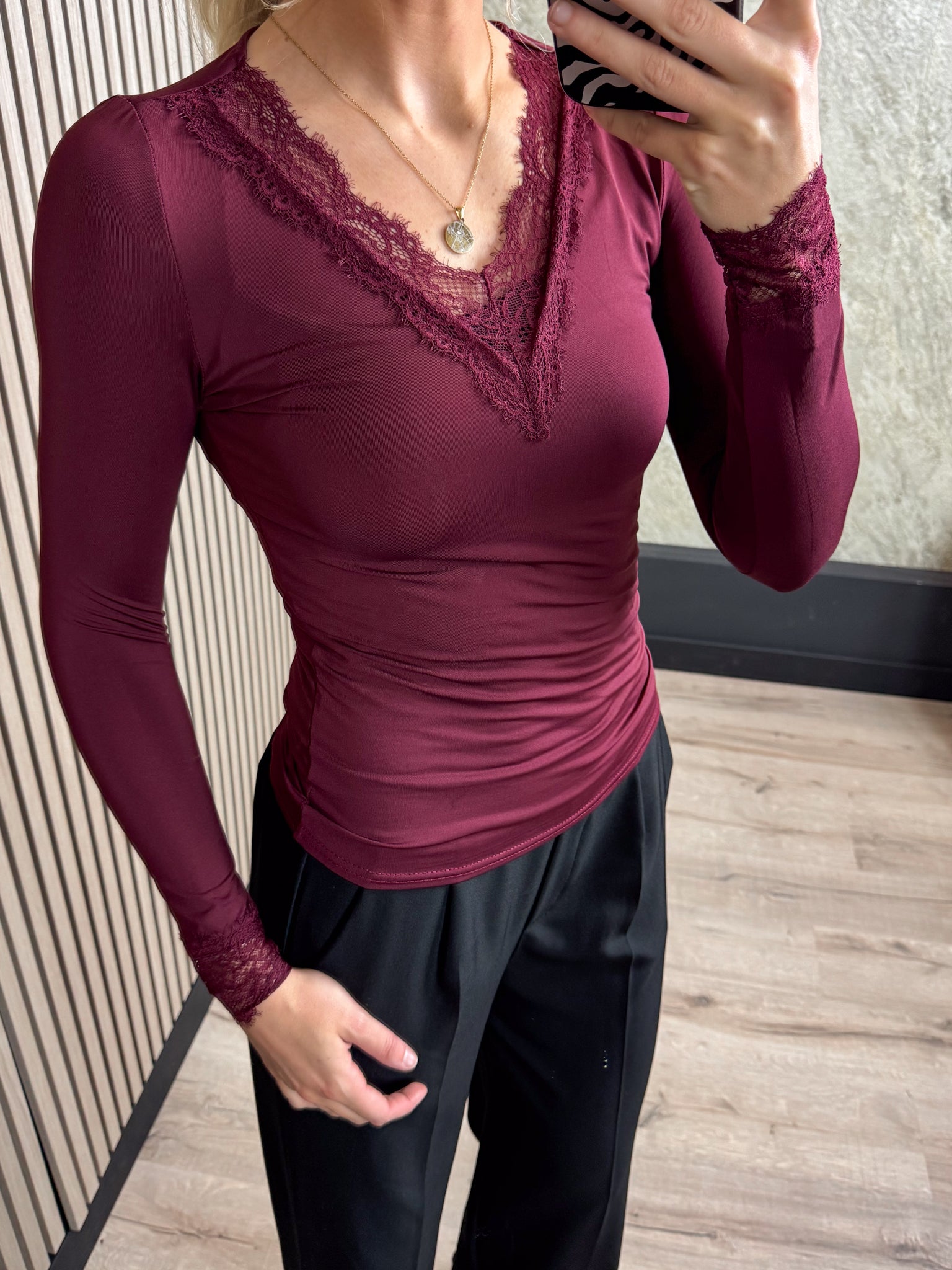 Deze prachtige top is een echte musthave voor dit najaar! De top heeft een elegante V-hals met een subtiel kanten detail dat ook terugkomt bij de mouwen.