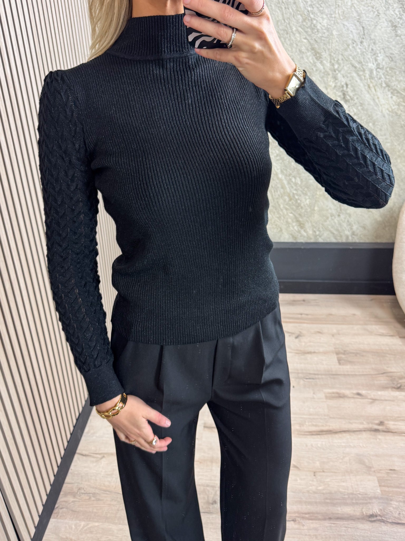 Deze top is een echte musthave. De top heeft een mooie hoge hals en een superleuke vissengraatstructuur op de mouwen.