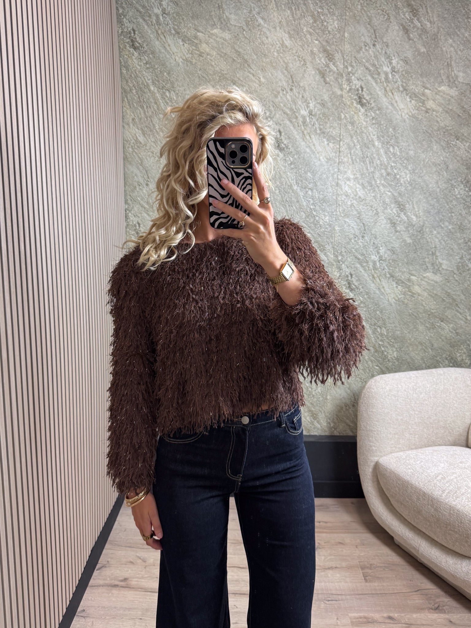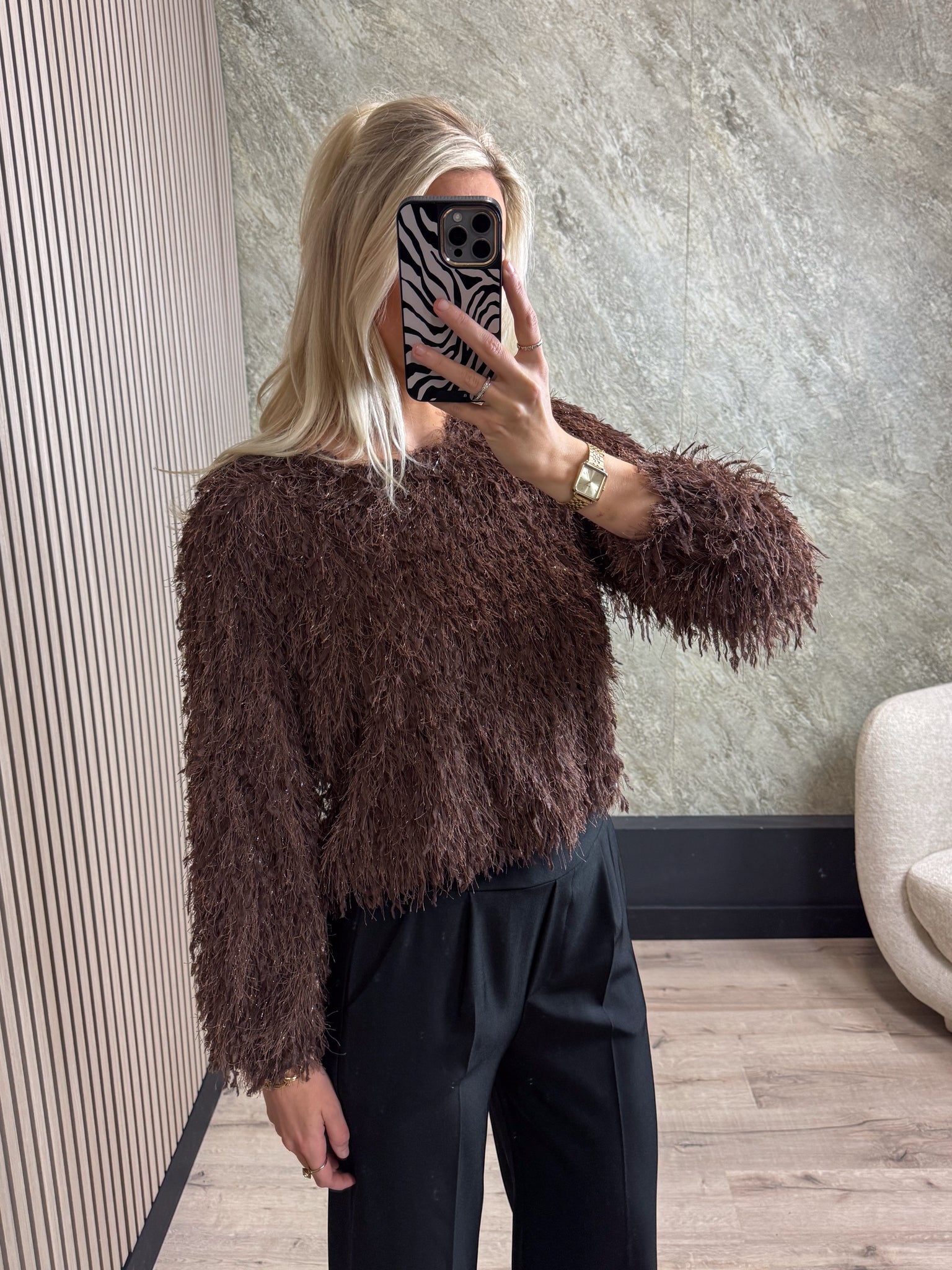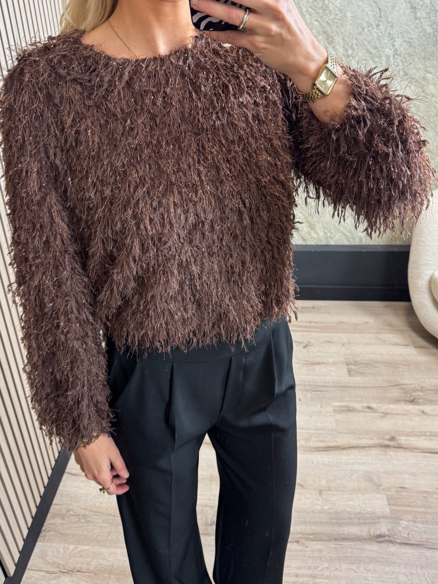 Deze top is een echte musthave! De verfijnde verenstructuur en de ronde hals zorgen voor een elegante en trendy uitstraling.