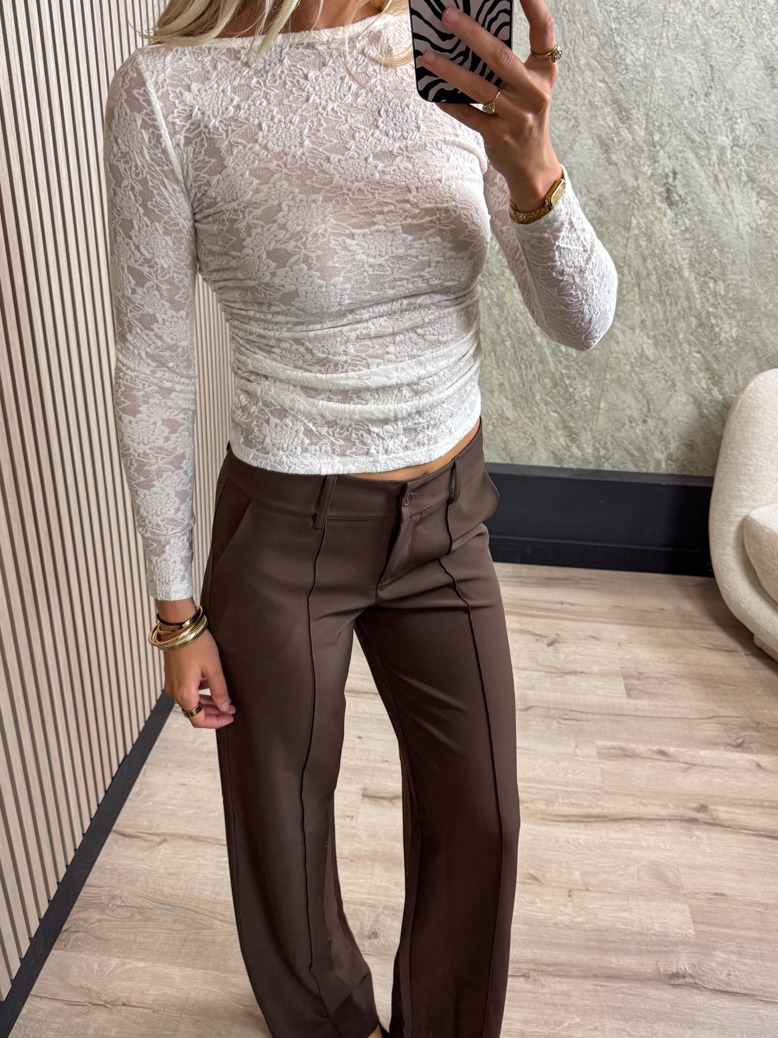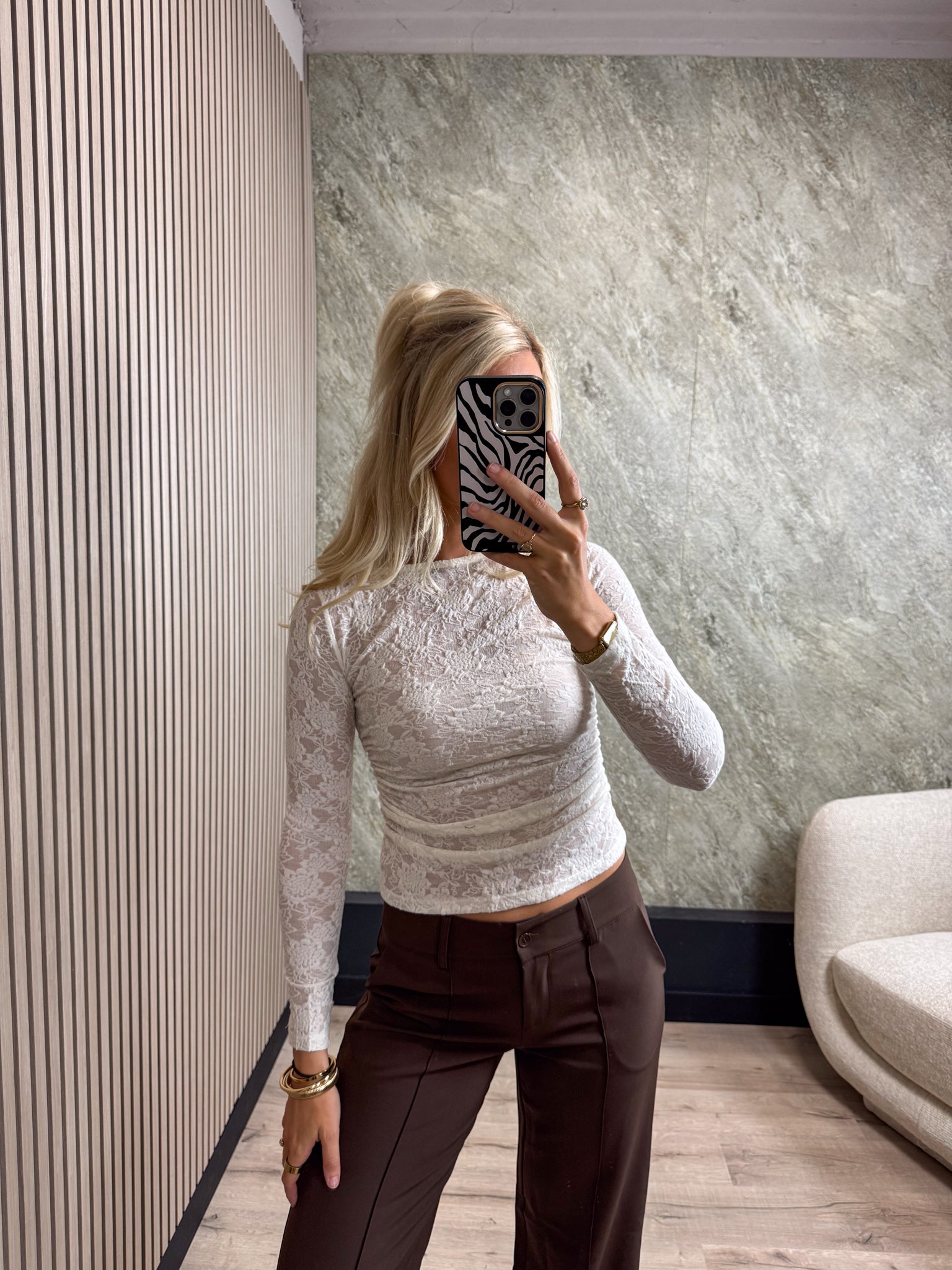 Deze top is een echte musthave. Met de subtiele transparante bloemenstructuur eindeloos te combineren.