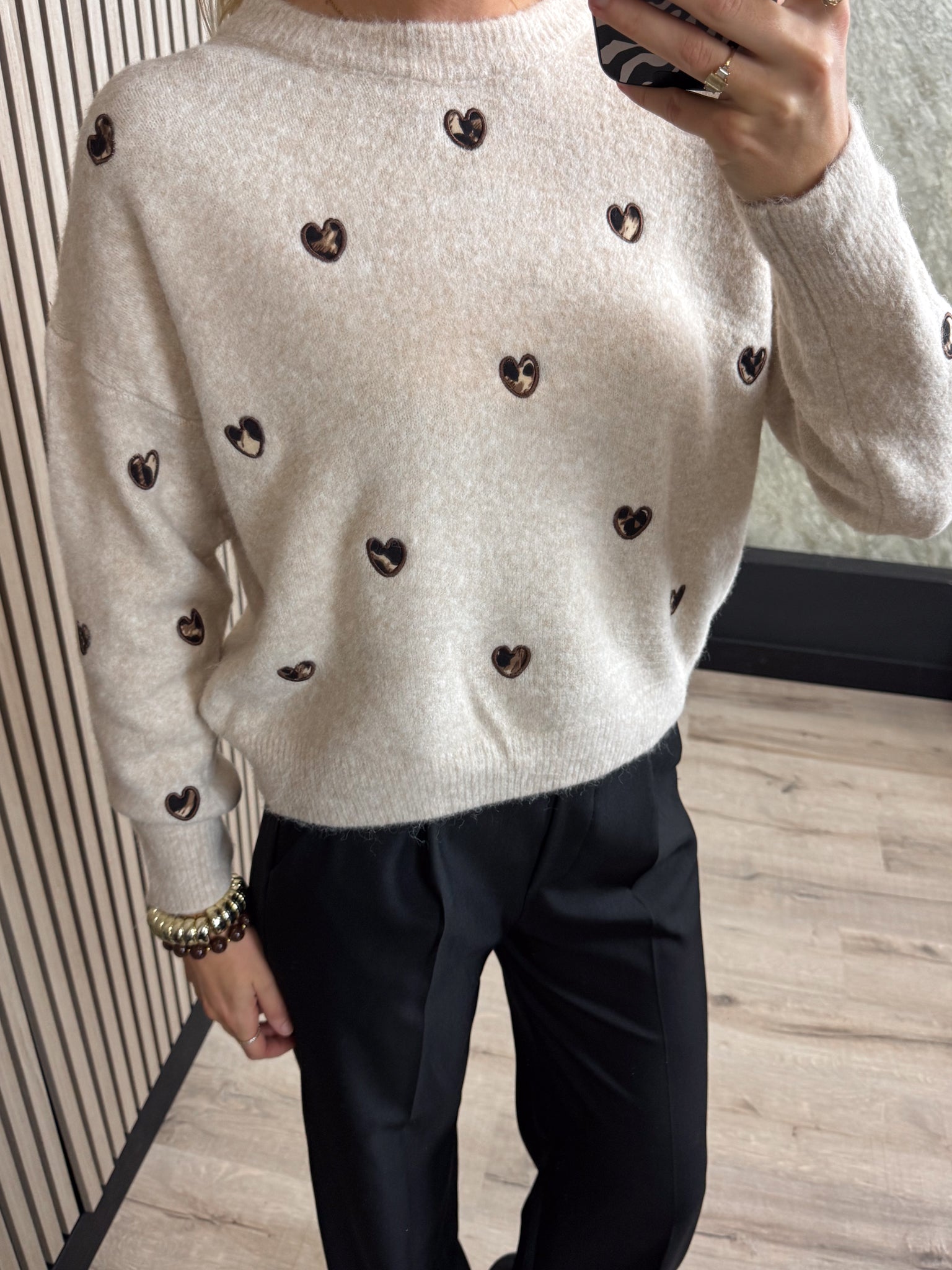Deze trui is een echte musthave voor dit najaar! De trui heeft een stijlvolle ronde hals en is versierd met speelse hartjes in een trendy tijgerprint.