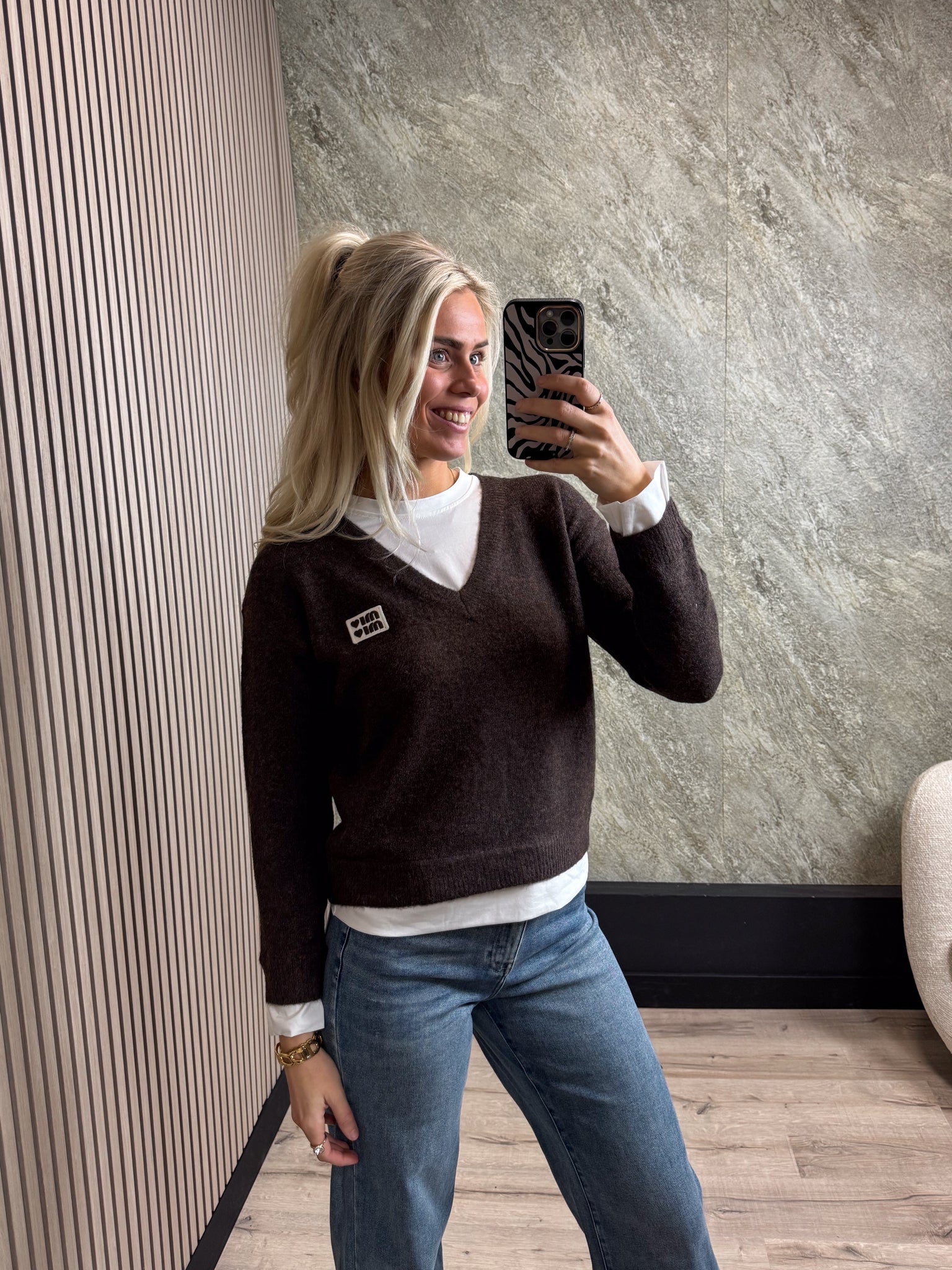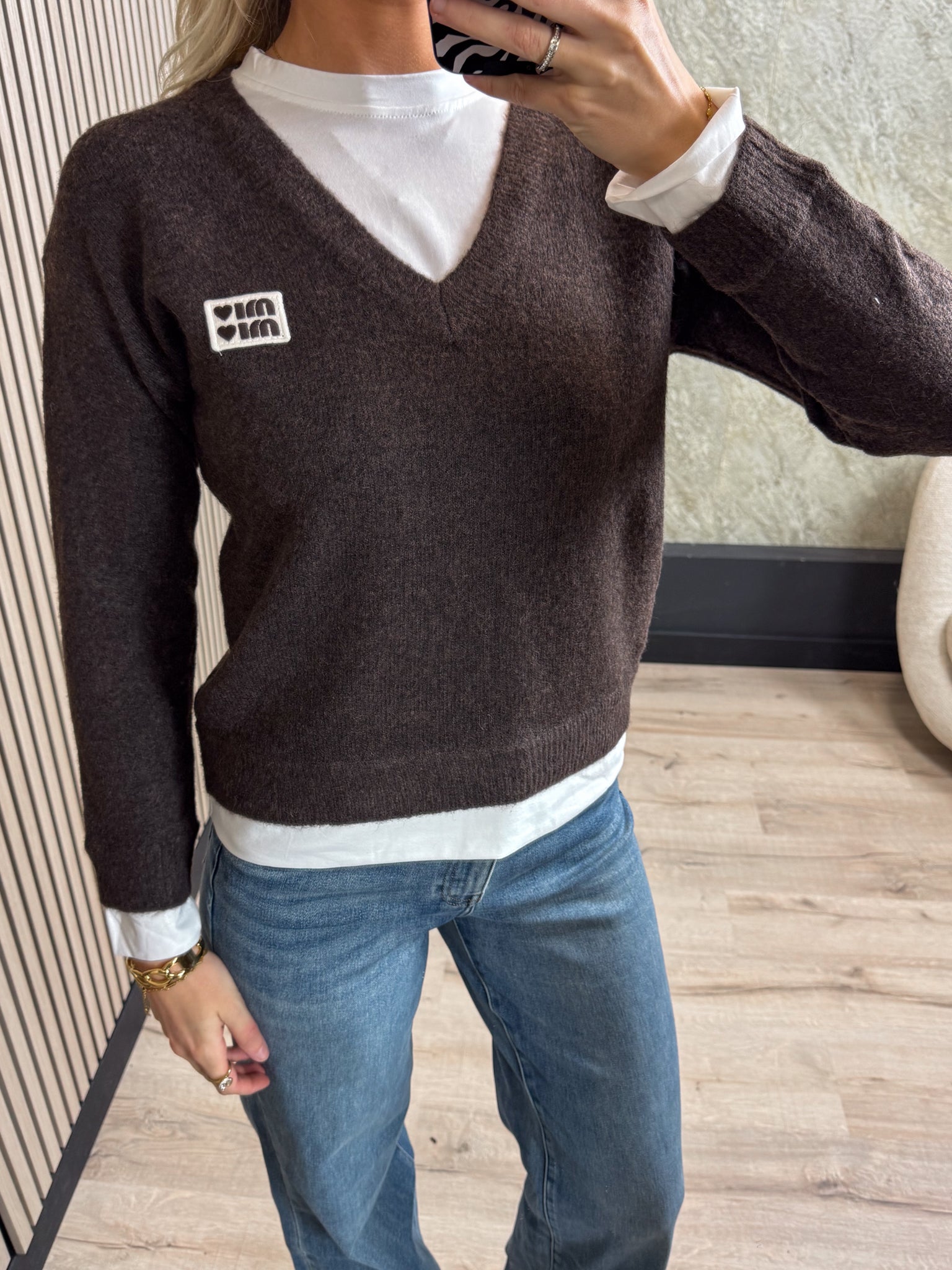 Deze trui is een echte musthave voor dit najaar. De trui heeft een mooie V-hals en onder de trui zit een neppe witte top, wat een mooi effect geeft.